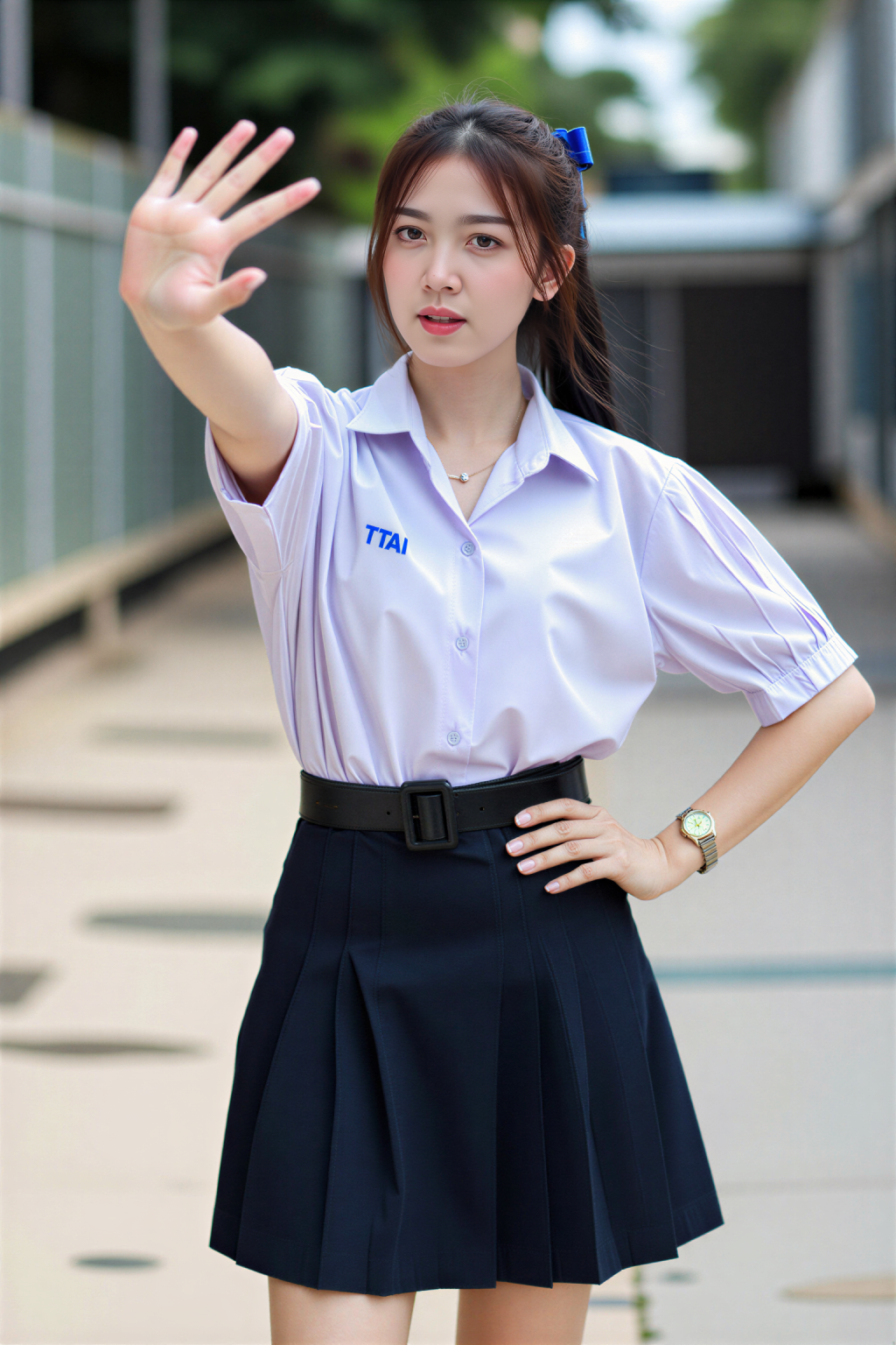 A young woman in a ThaiTGS shirt with blue lettering "TTAI" on the chest and a navy blue pleated skirt stands outdoors, waving with one hand while the other rests on her hip, under soft natural daylight with a blurred urban background. She has long dark hair tied back with a blue hair accessory and looks directly at the camera with a gentle smile. The scene is captured from a slightly low angle, emphasizing her confident pose and casual elegance.