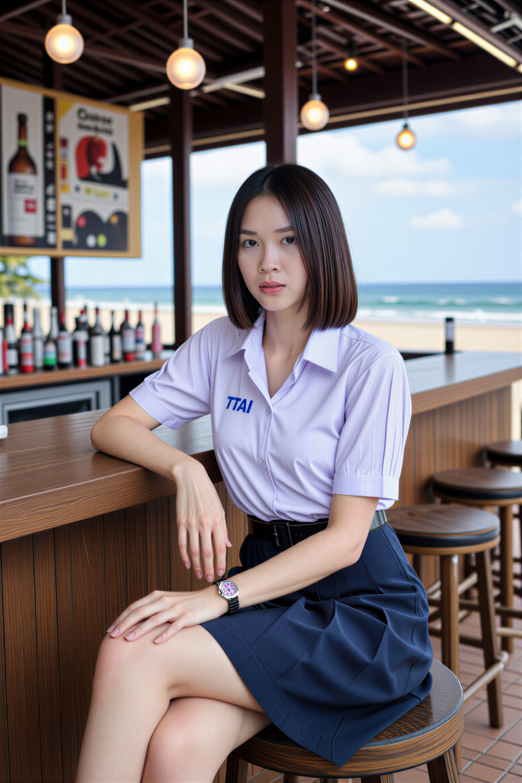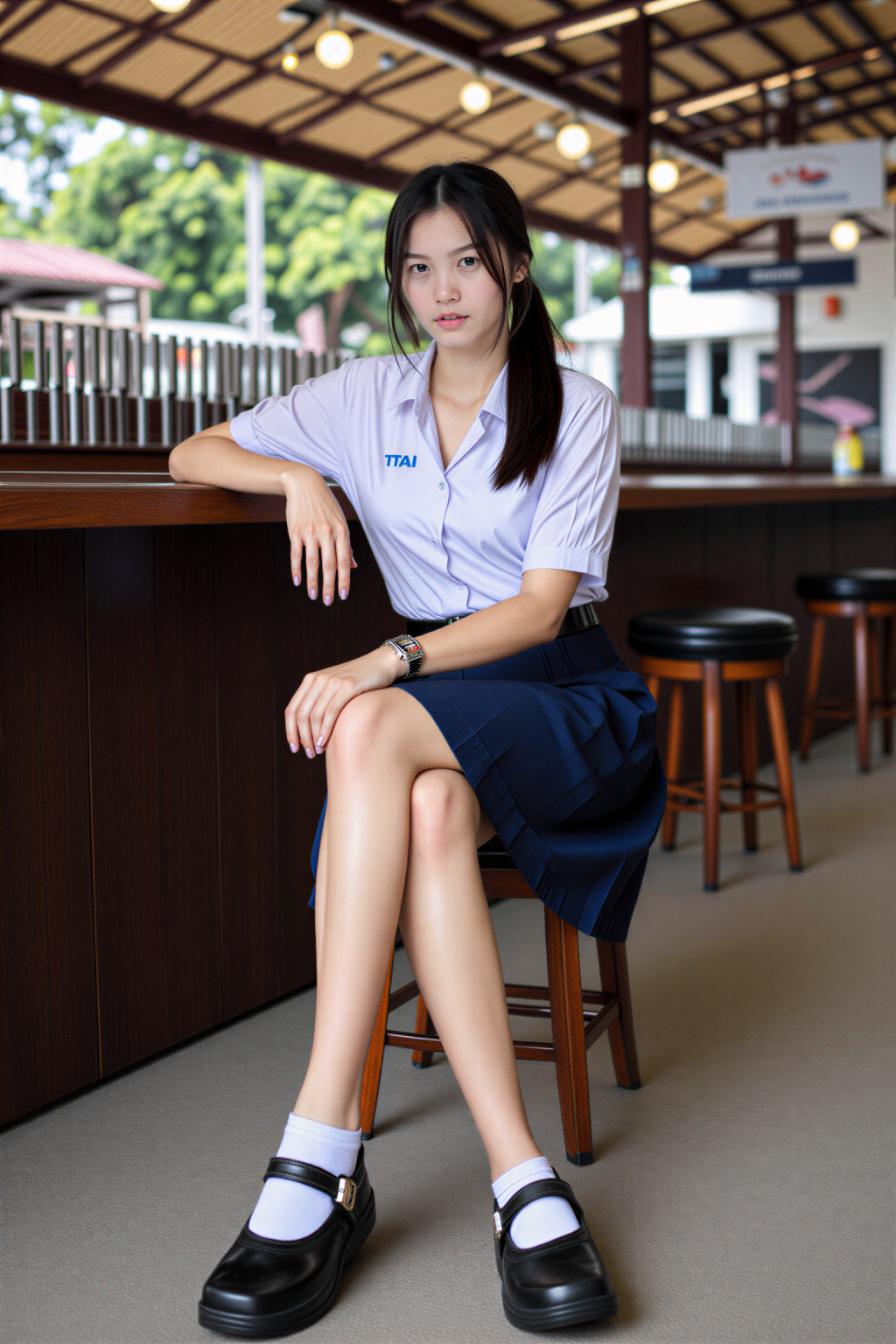 A young woman in a ThaiTGS shirt with blue "TTAI" lettering and a navy blue pleated skirt stands outdoors, leaning casually against a colorful metal railing with purple and yellow poles, smiling warmly under soft natural daylight, with a blurred background of green grass and wooden structures.