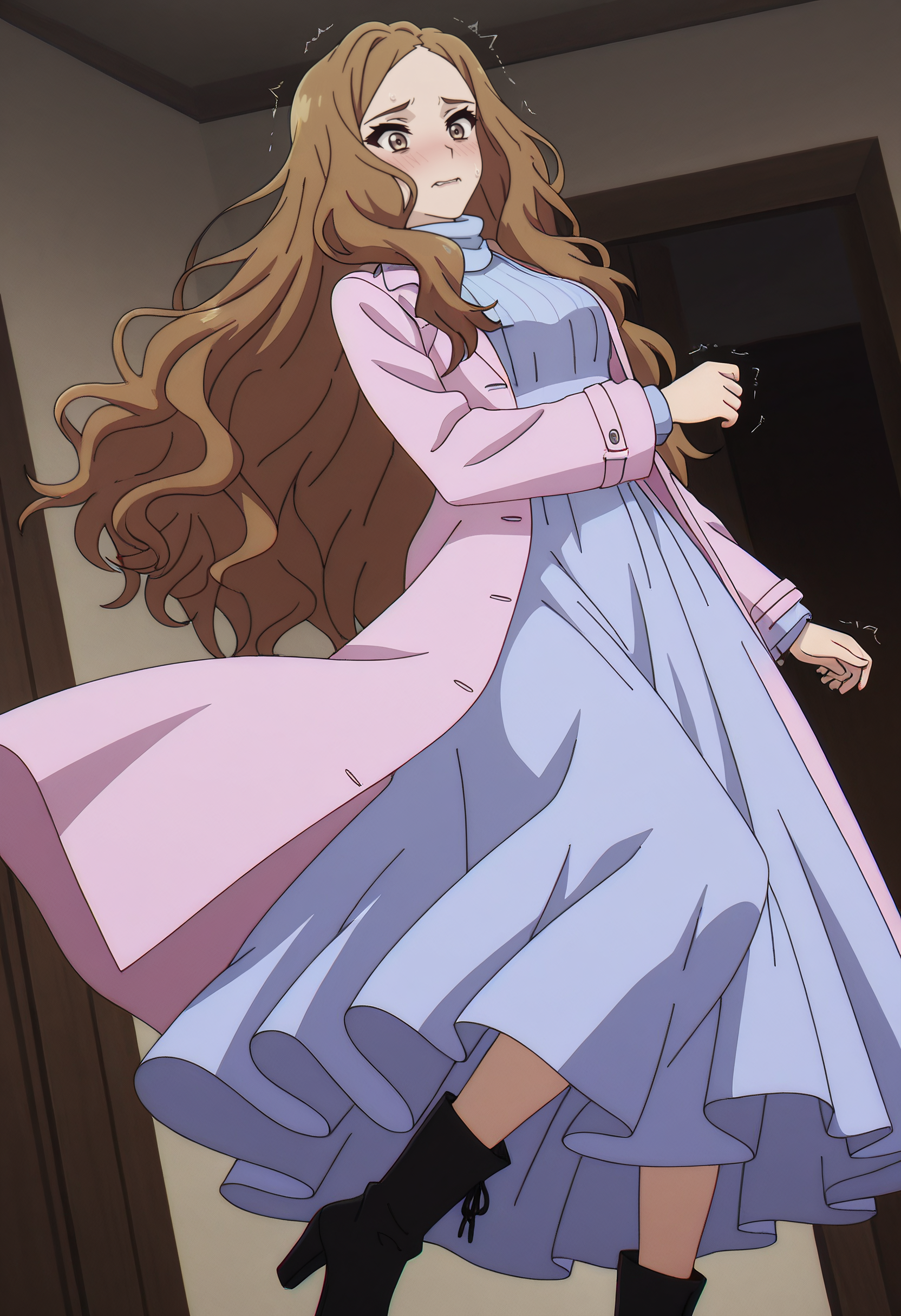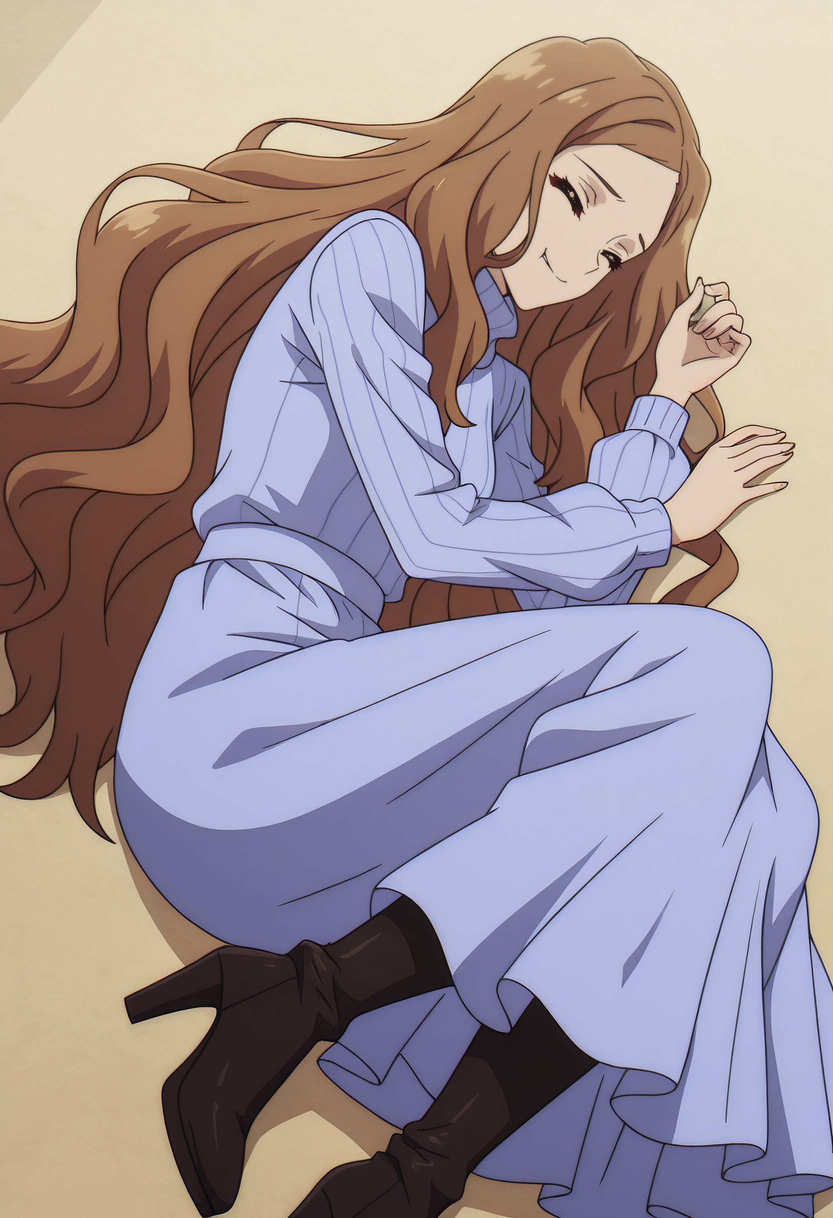 DaryaDress、長袖、タートルネック、青いドレス、ドレス、ブーツ、黒い靴、ロングドレス、ハイヒール、リブニット、セーター、青いセーター