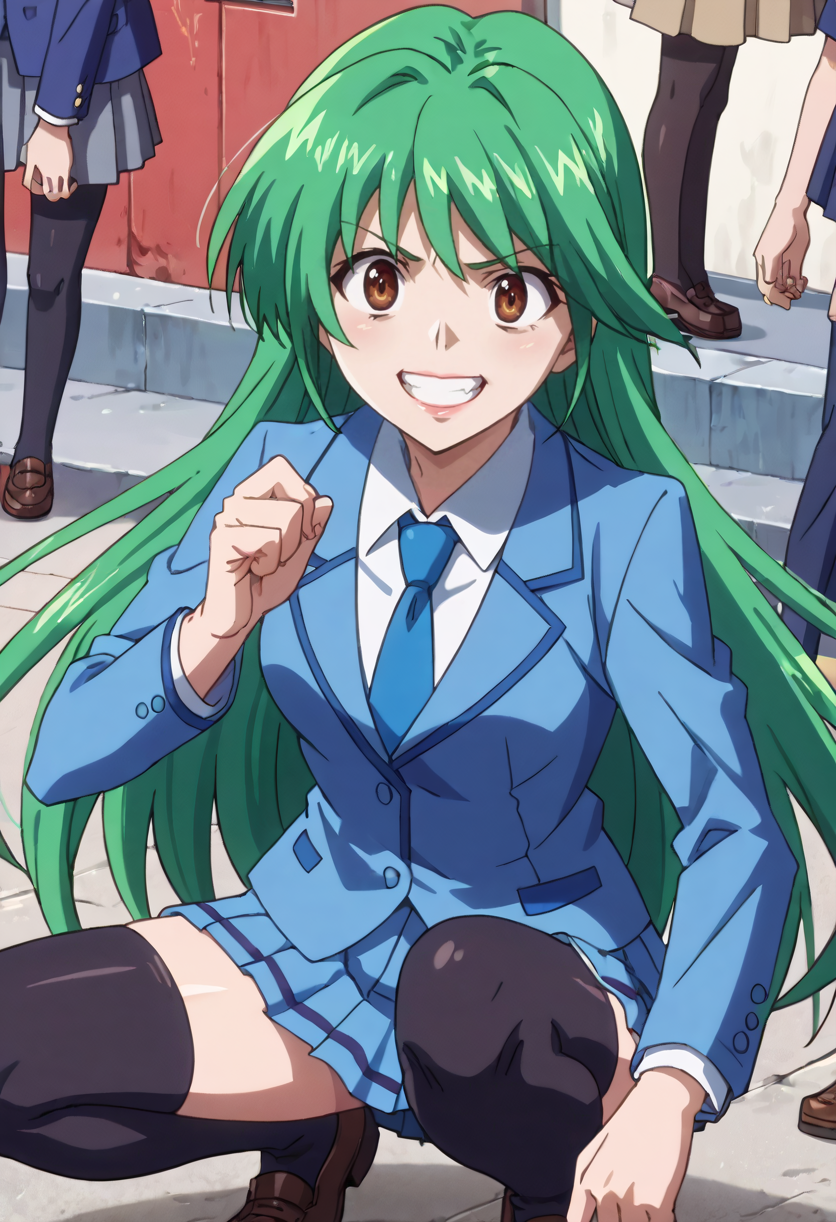YuuSchool,校服,领带,夹克,西装外套,衬衫,长袖,蓝色夹克,蓝色领带,过膝袜,有领衬衫,绝对领域,裙子,百褶裙,黑色过膝袜,