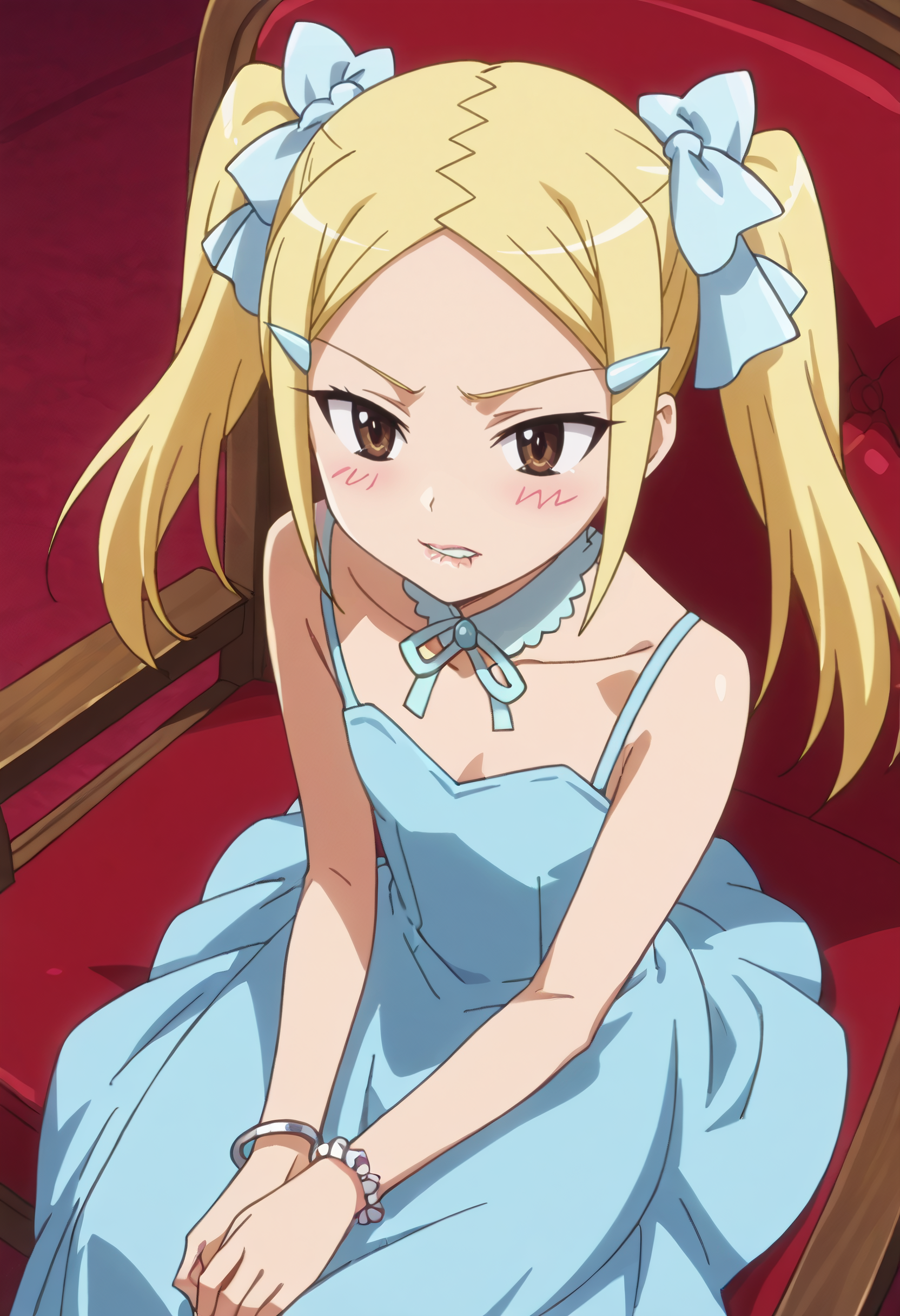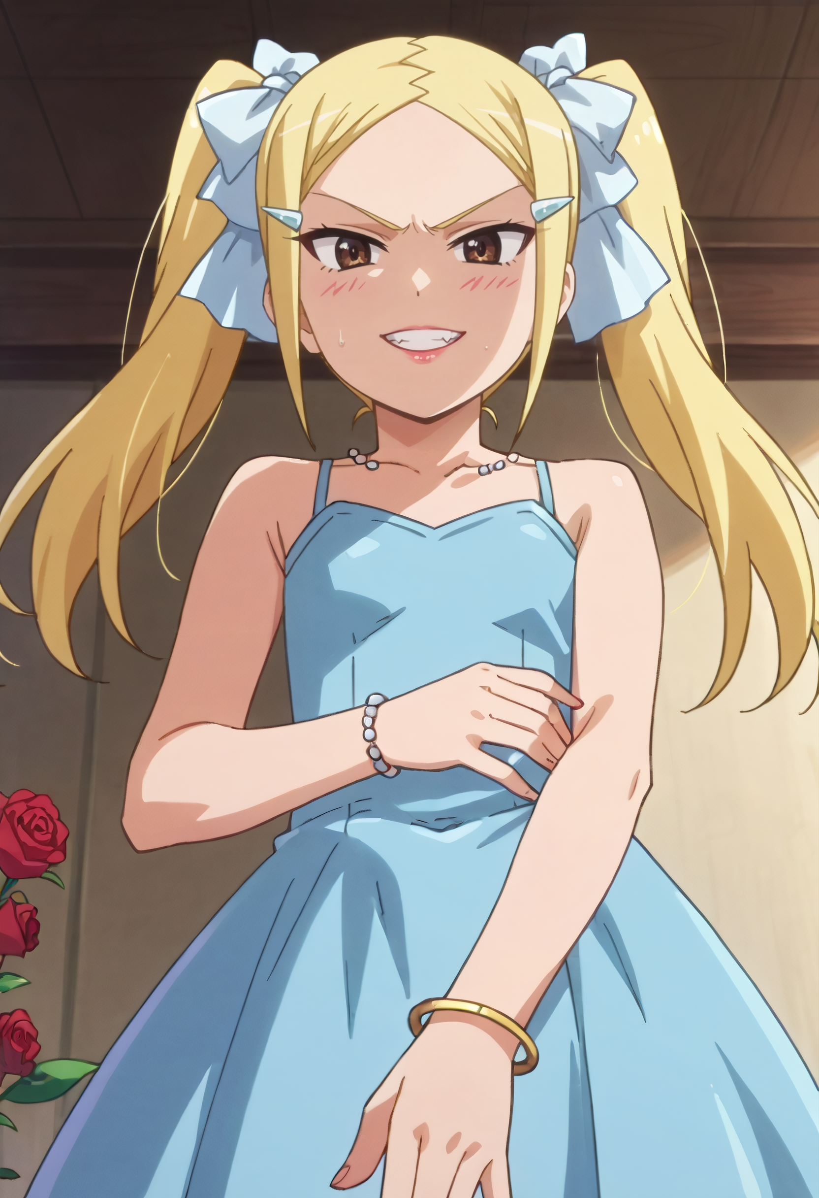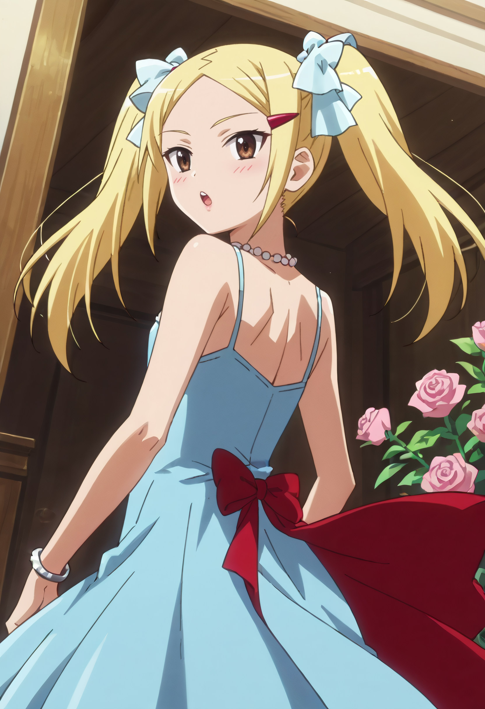 MioDress、リボン、ヘアリボン、ヘアクリップ、髪飾り、ドレス、ブレスレット、ジュエリー、肩出し、青いドレス、花、薔薇、ロングドレス、リボン、ガウン、ノースリーブドレス、髪のリボン、