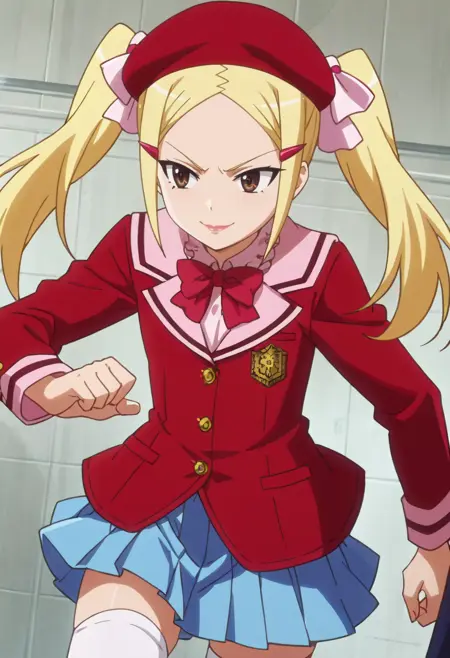 MioShirt、学校制服、ヘアクリップ、髪飾り、リボン、帽子、リボン、太ももハイソックス、スカート、プリーツスカート、ベレー帽、ジャケット、ブレザー、ボウタイ、ヘアリボン、青いスカート、セーラー服、赤いリボン、赤いボウタイ、白い太ももハイソックス、