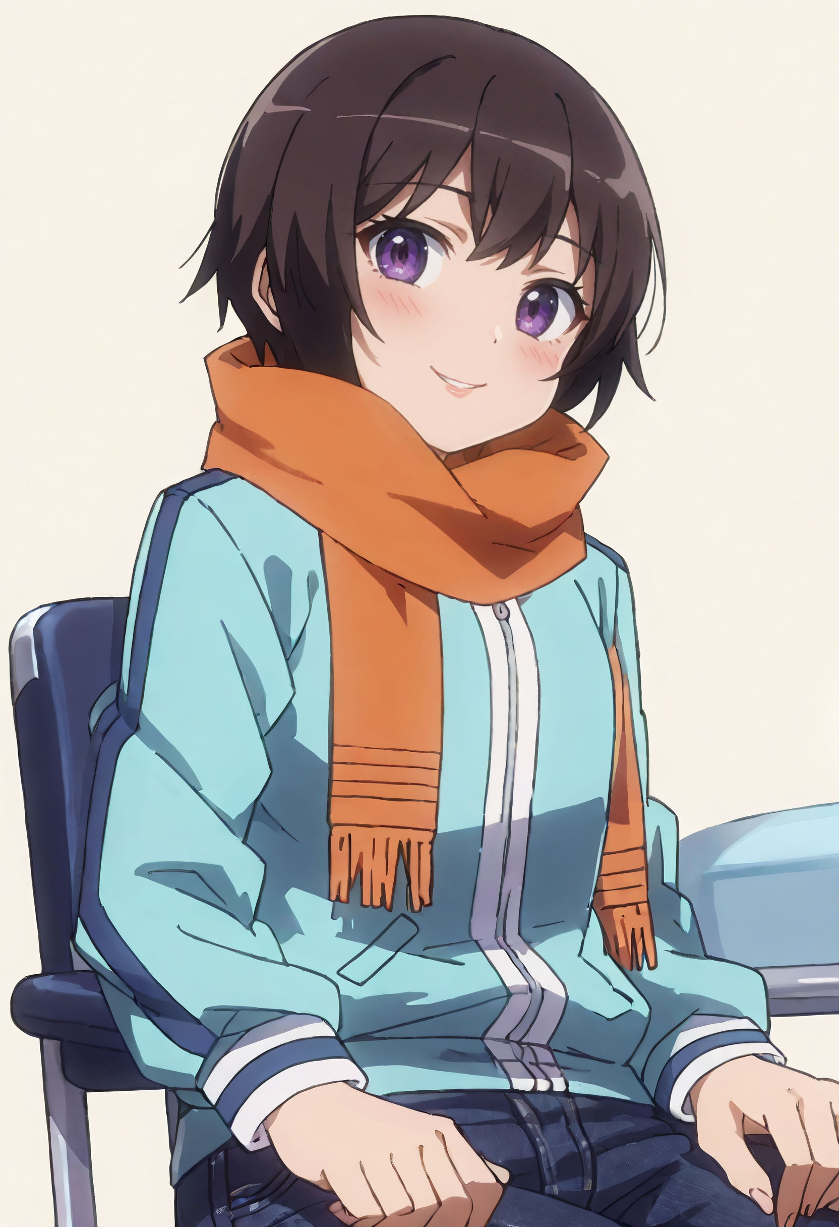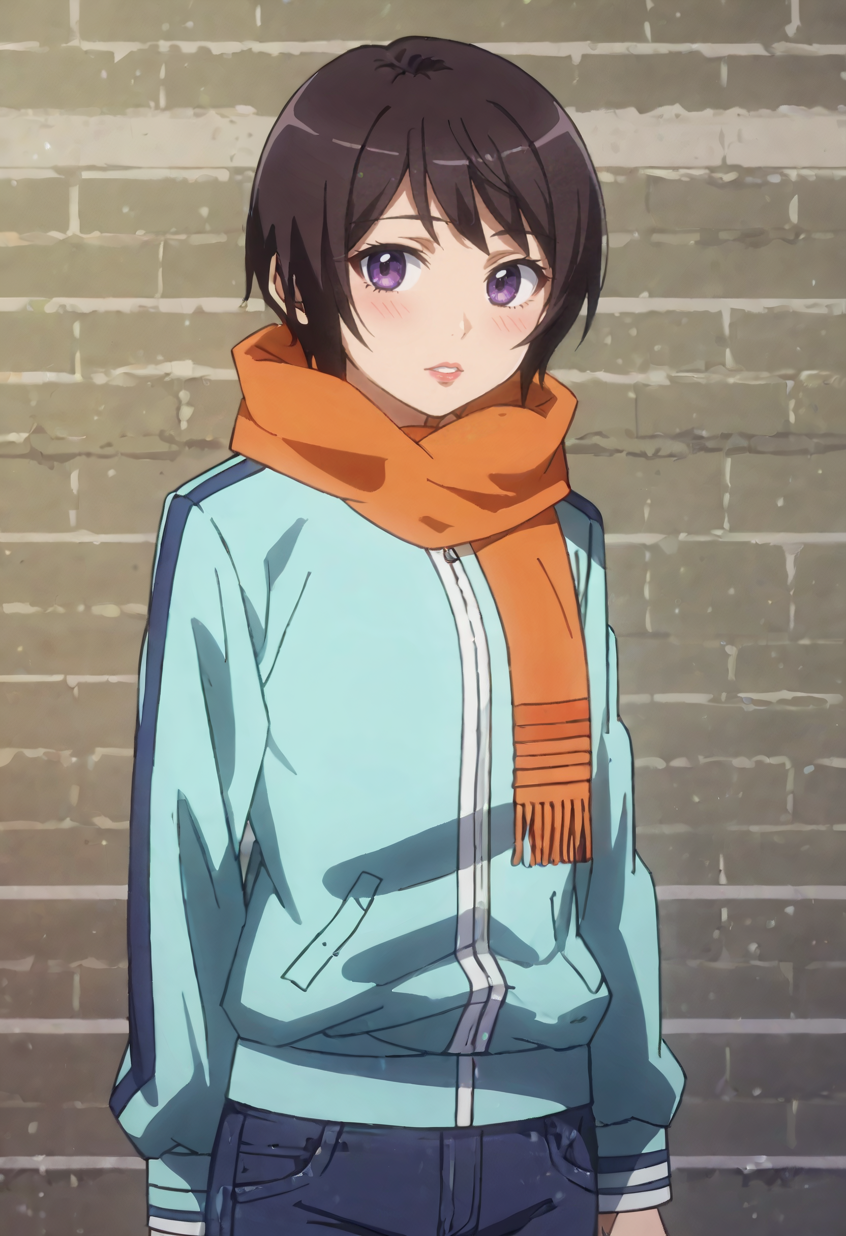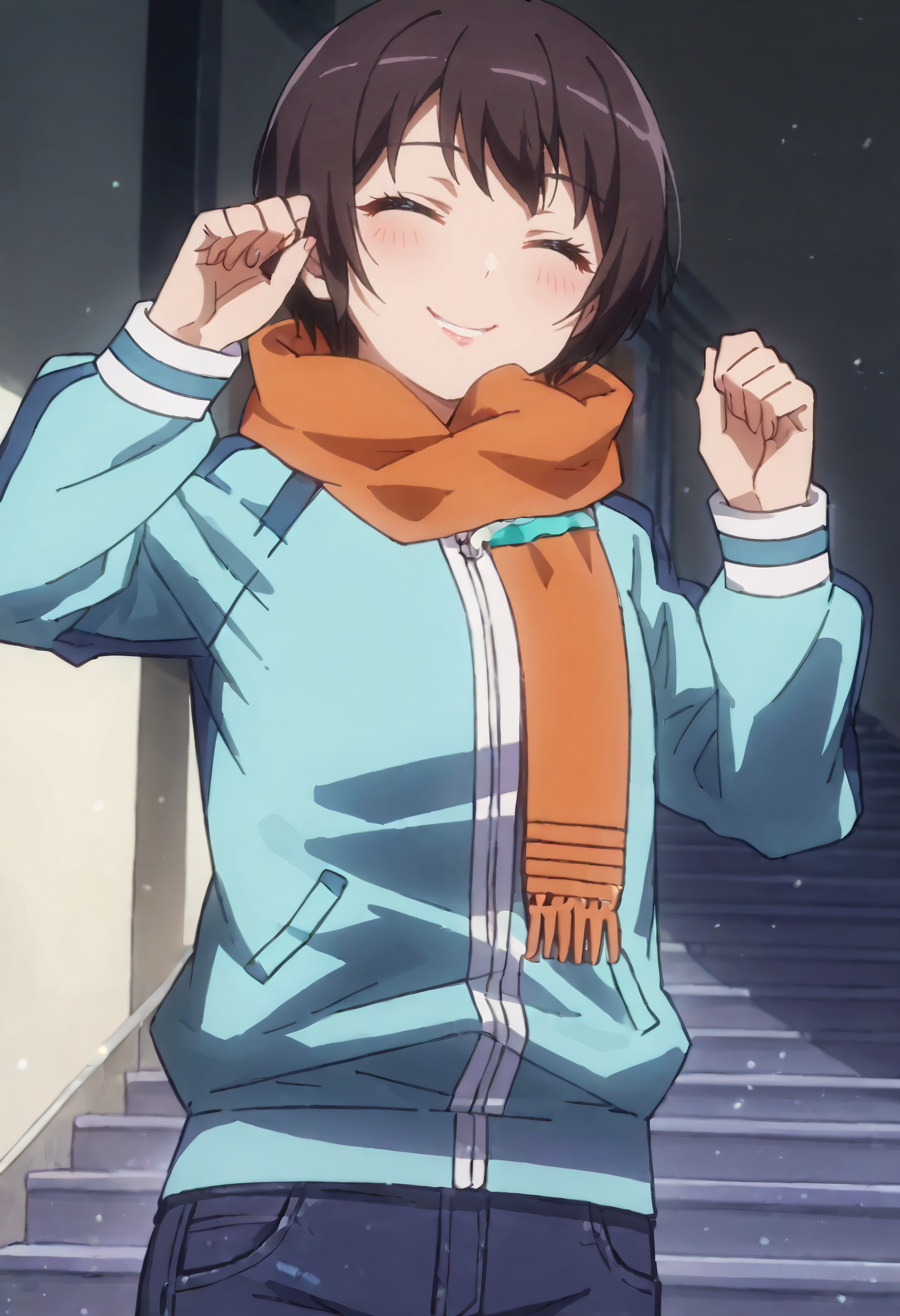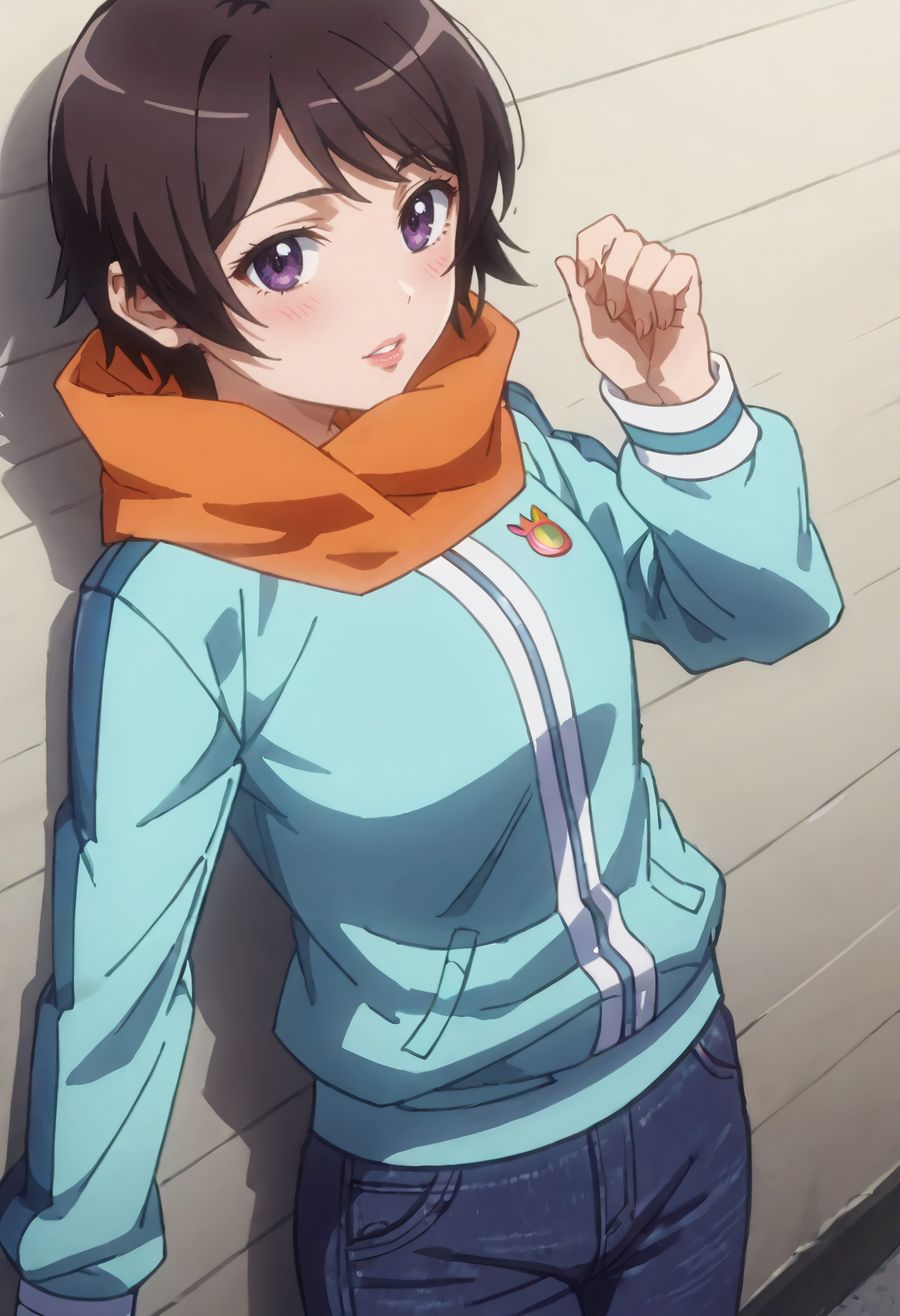 YuriCOutfit、オレンジのスカーフ、スカーフ、ジャケット、長袖、ズボン、トレーニングジャケット、トレーニングパンツ、青いジャケット、ジーンズ、デニム、