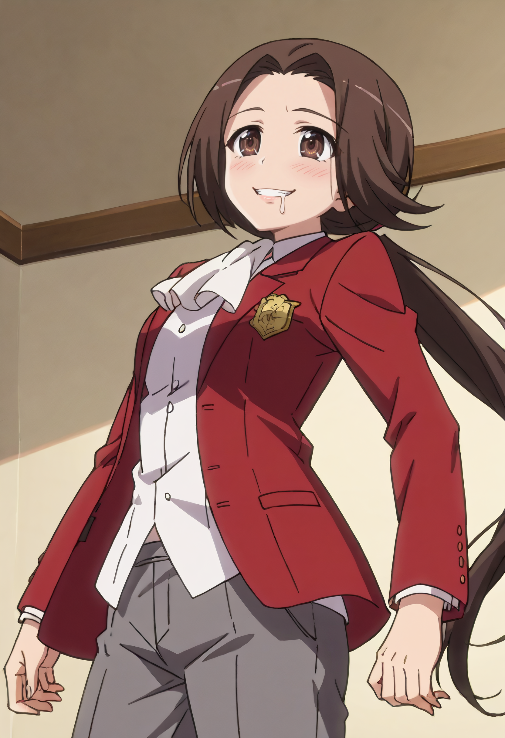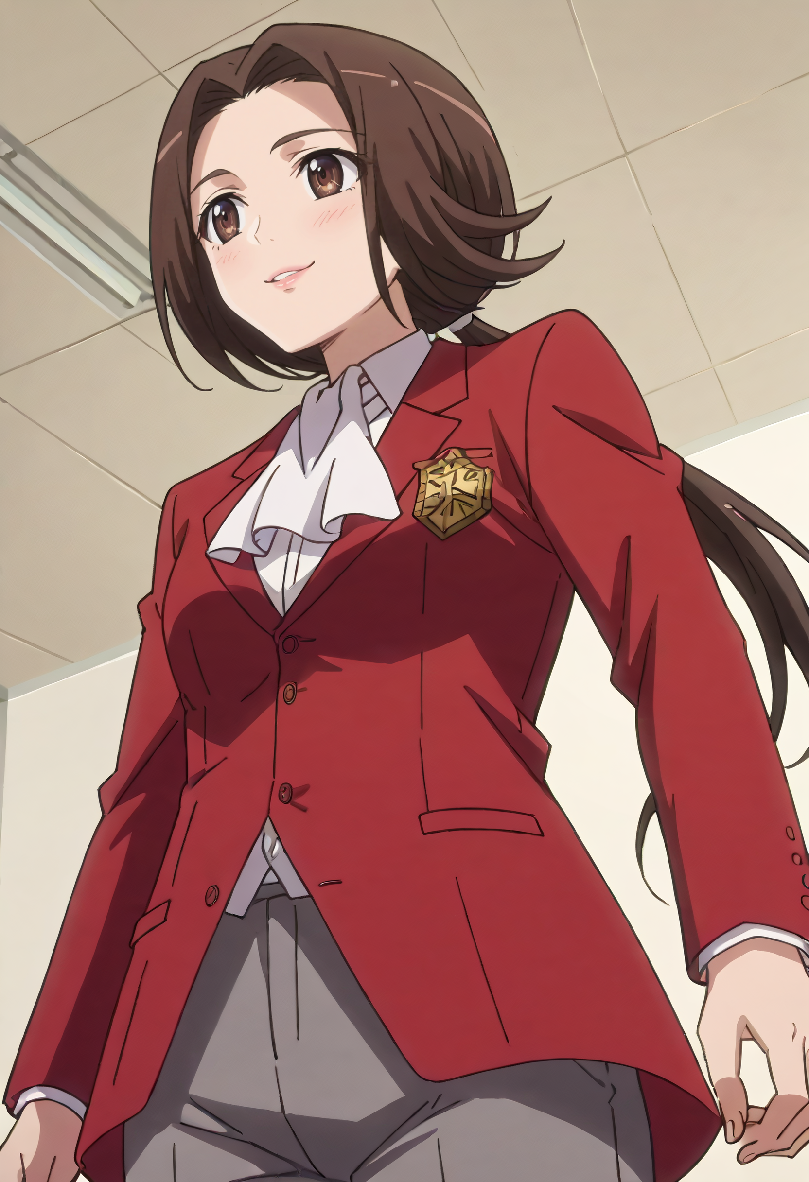 YuiSchool、ジャケット、アスコット、白いアスコット、長袖、赤いジャケット、学校制服、ブレザー、スーツ、エンブレム、フォーマルウェア、赤いスーツ、ズボン、灰色のズボン、