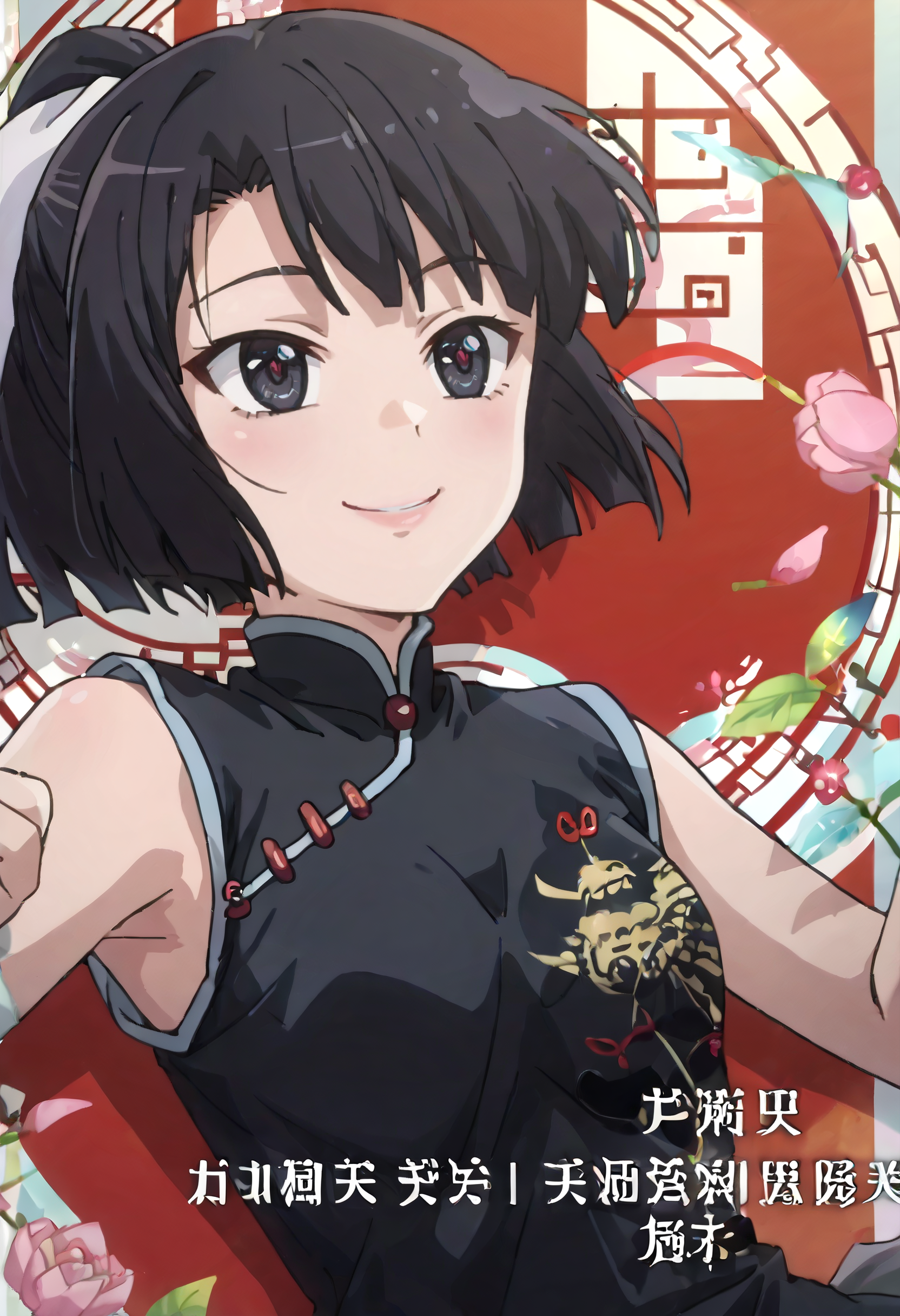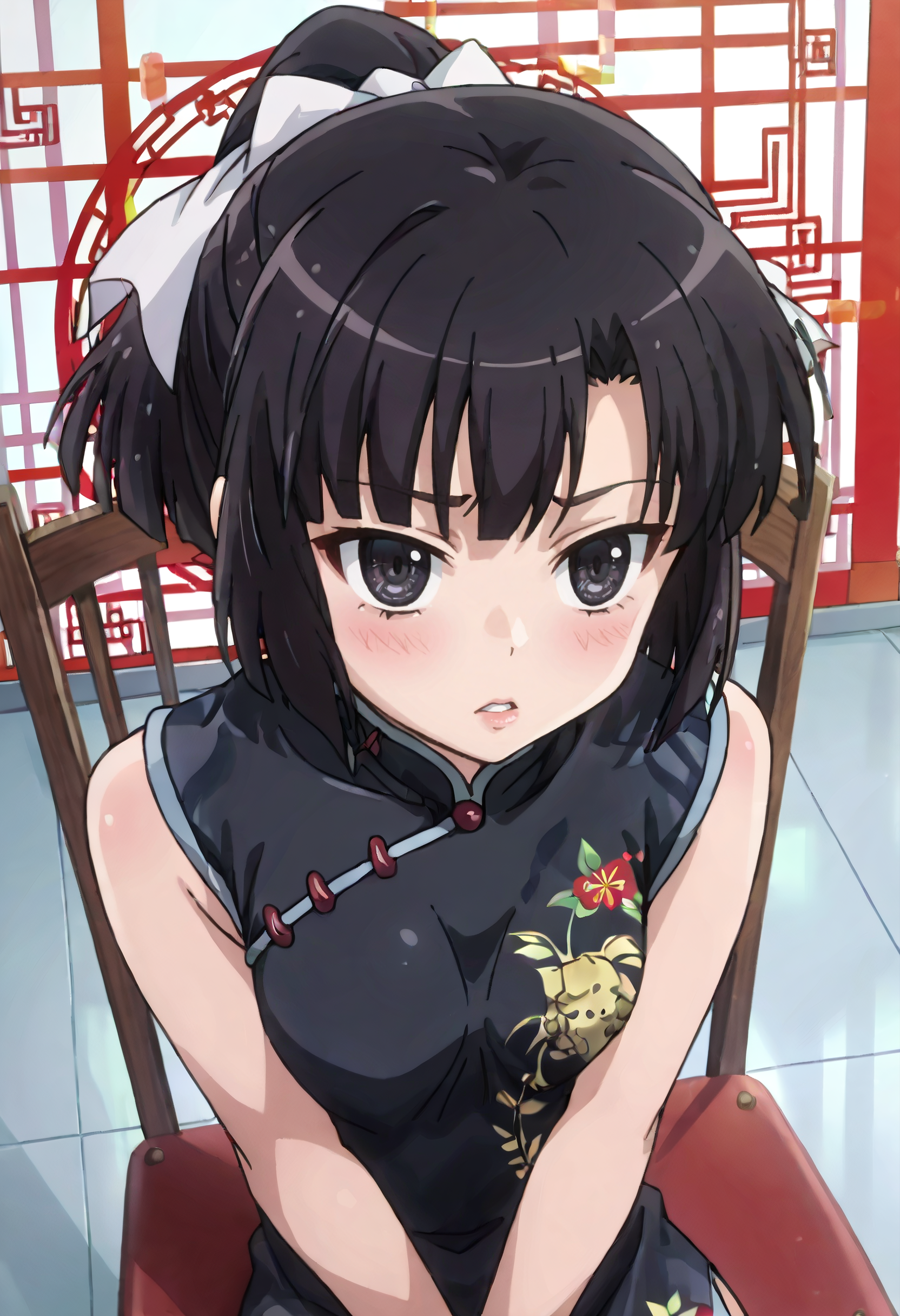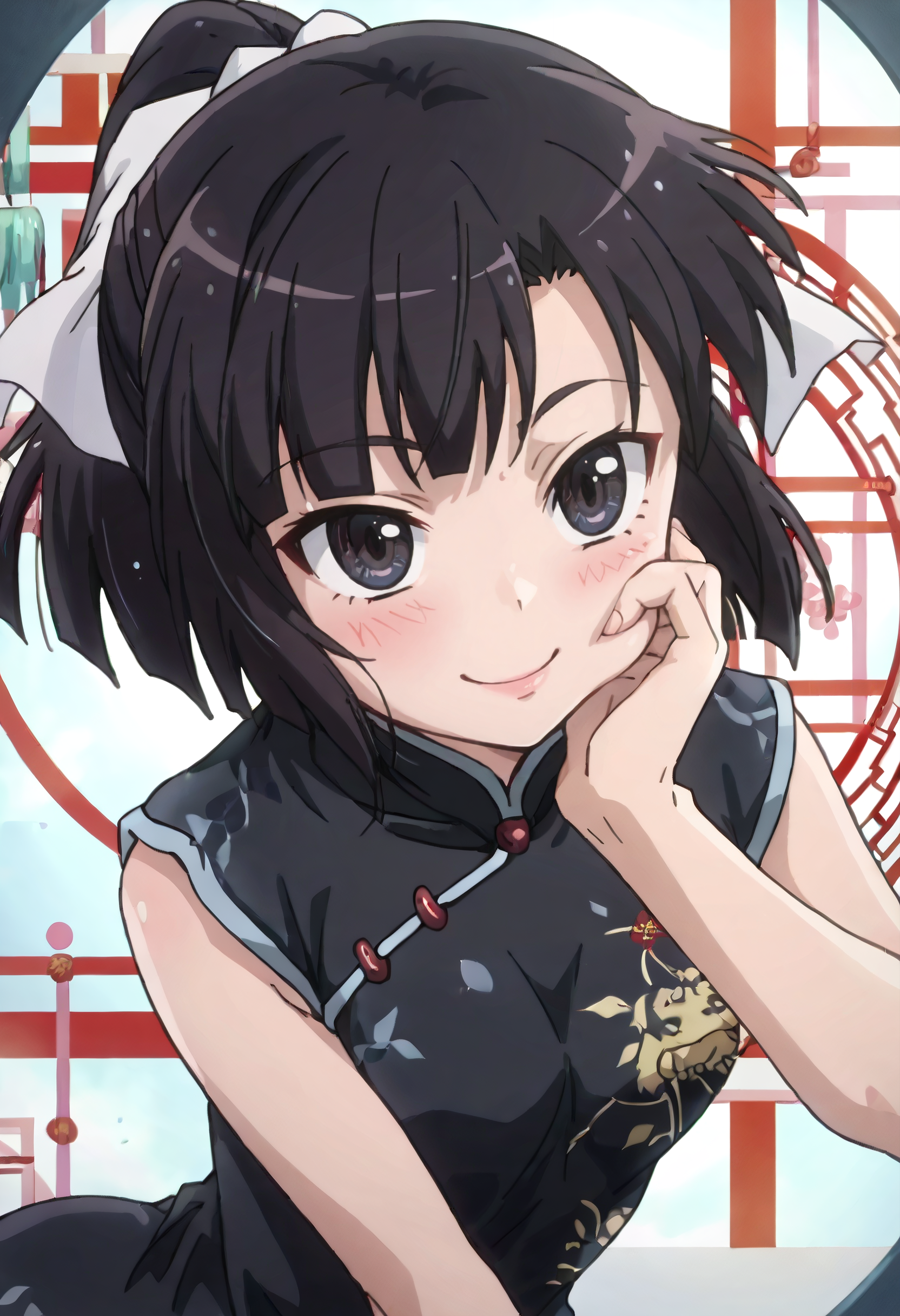 SumireOutfit、中国服、チャイナドレス、ドレス、黒いドレス、リボン、髪のリボン、ノースリーブ、肩出し、白いリボン、