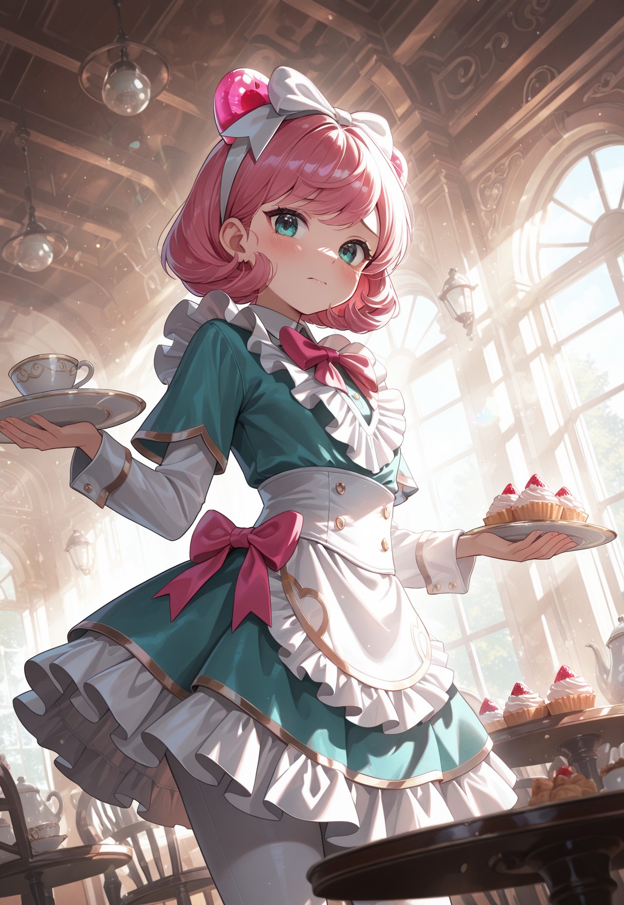 CCannie, short hair, pink hair, maid hair bow, hair ornaments, jade green eyes, maid outfit, multicolored dress, ruffled dress, white pantyhose,
