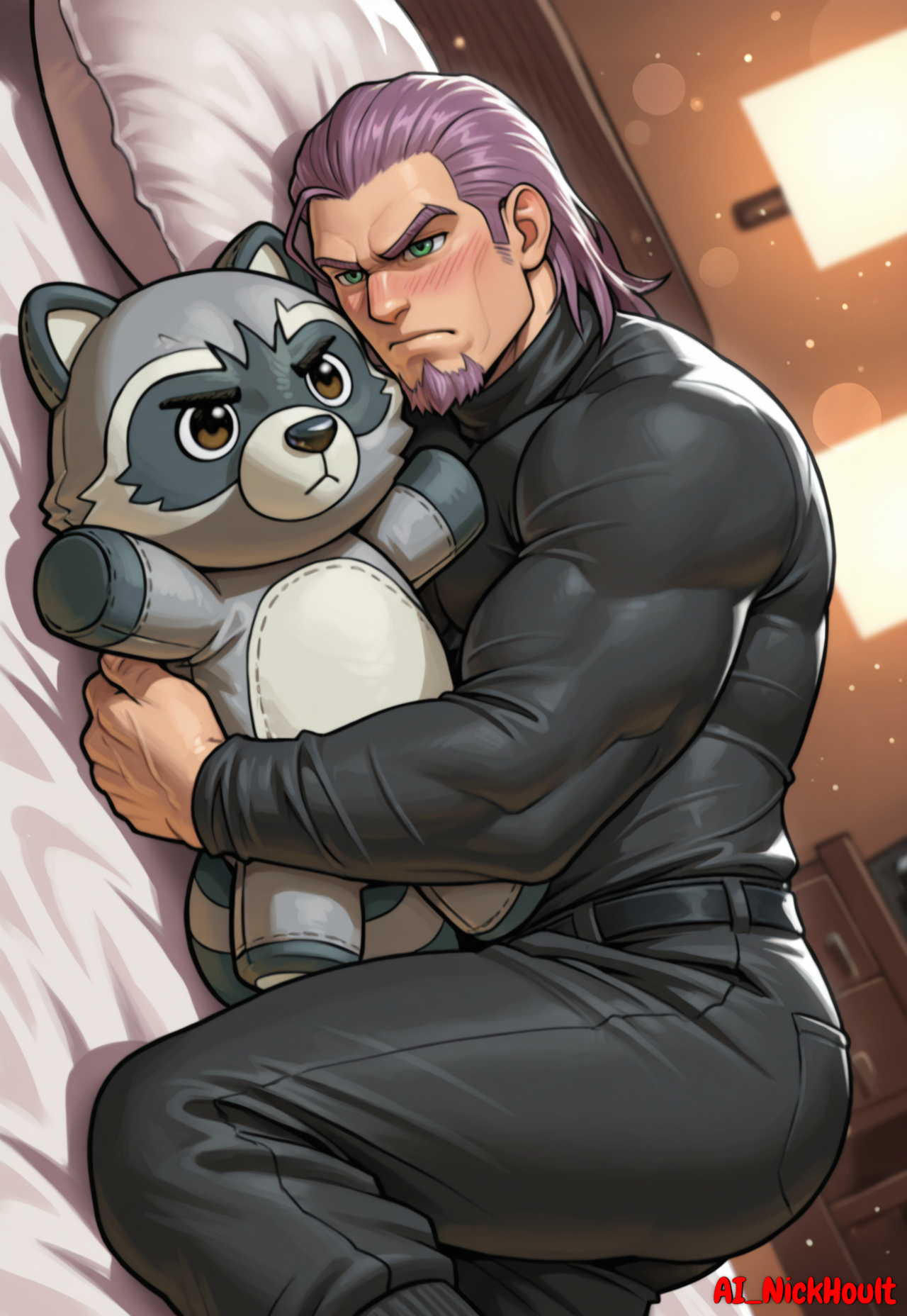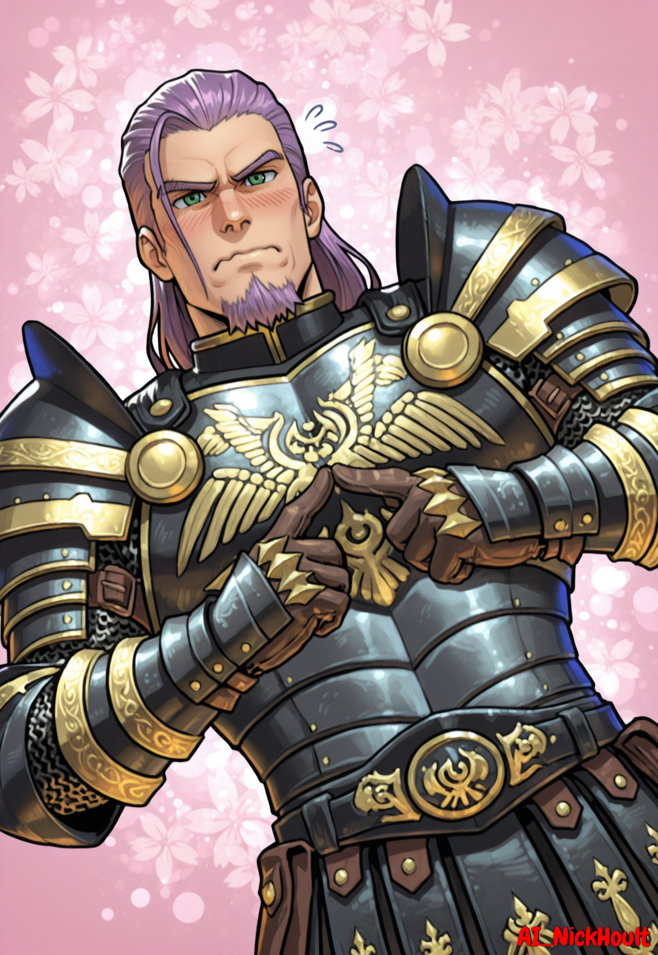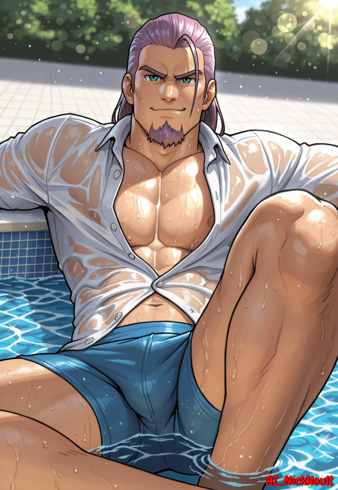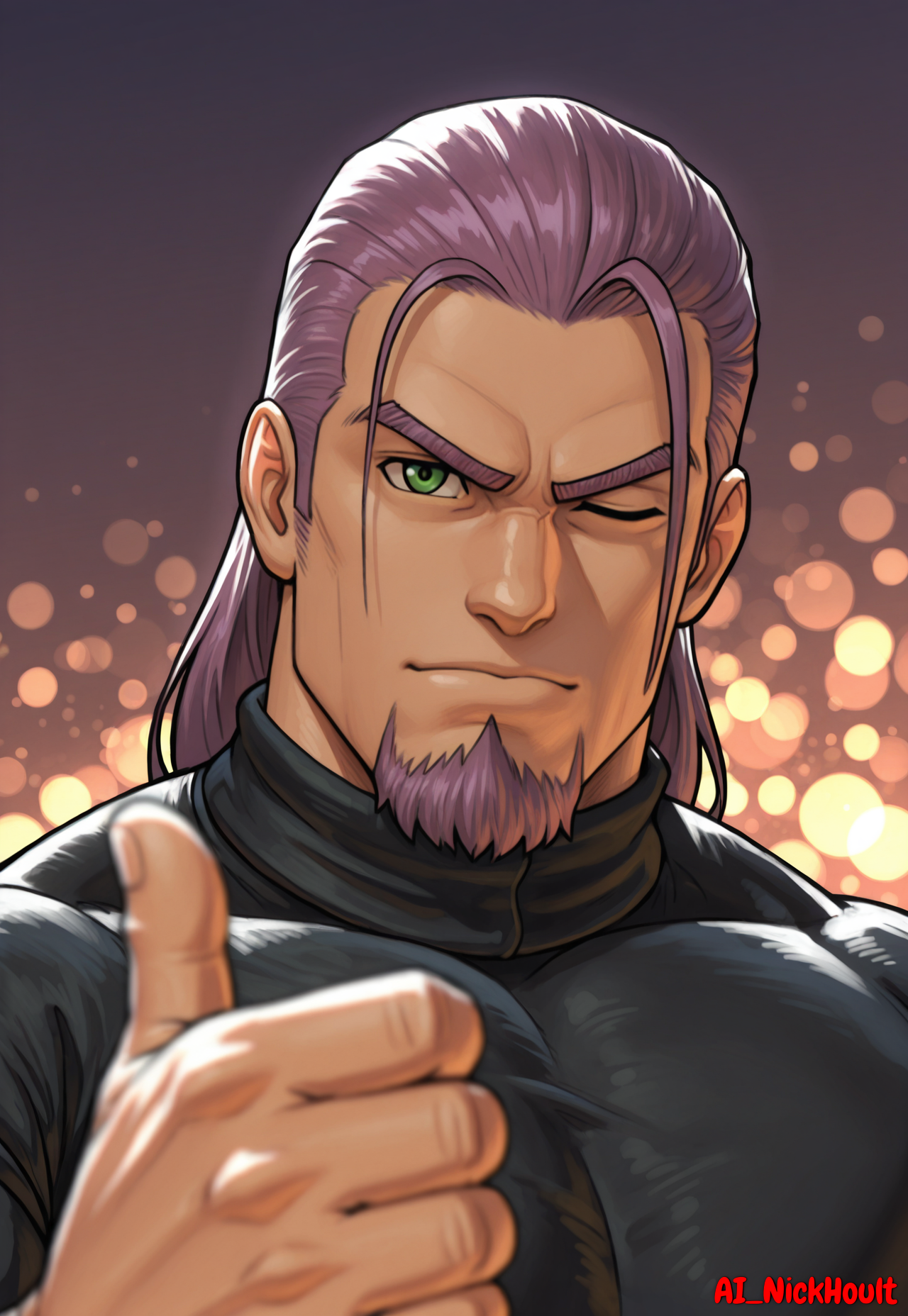 Hendrik, mature man, muscular build, sharp features, green eyes, shoulder-length purple hair, single strand of hair over left side of face, facial hair, goatee, hair slicked back,