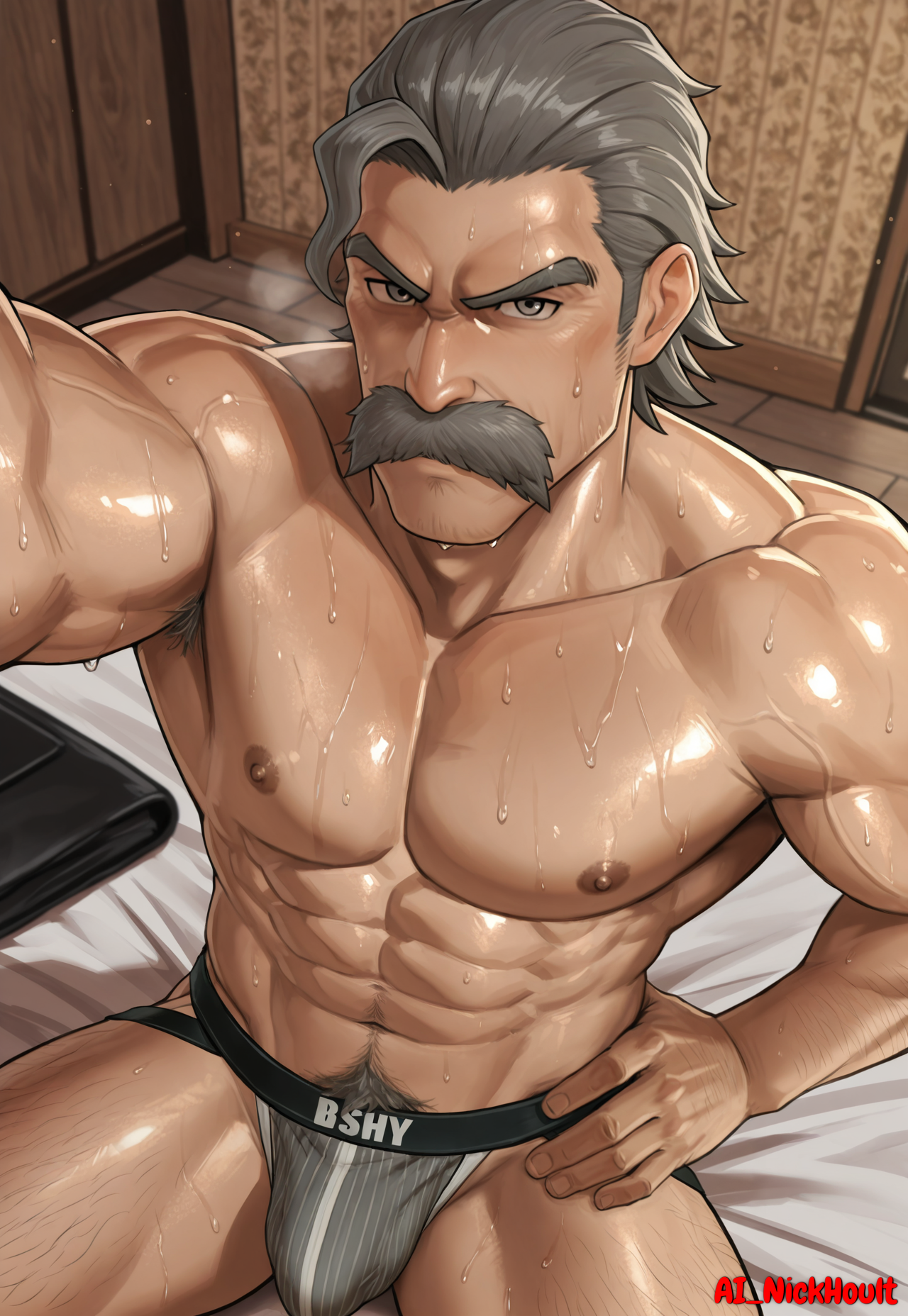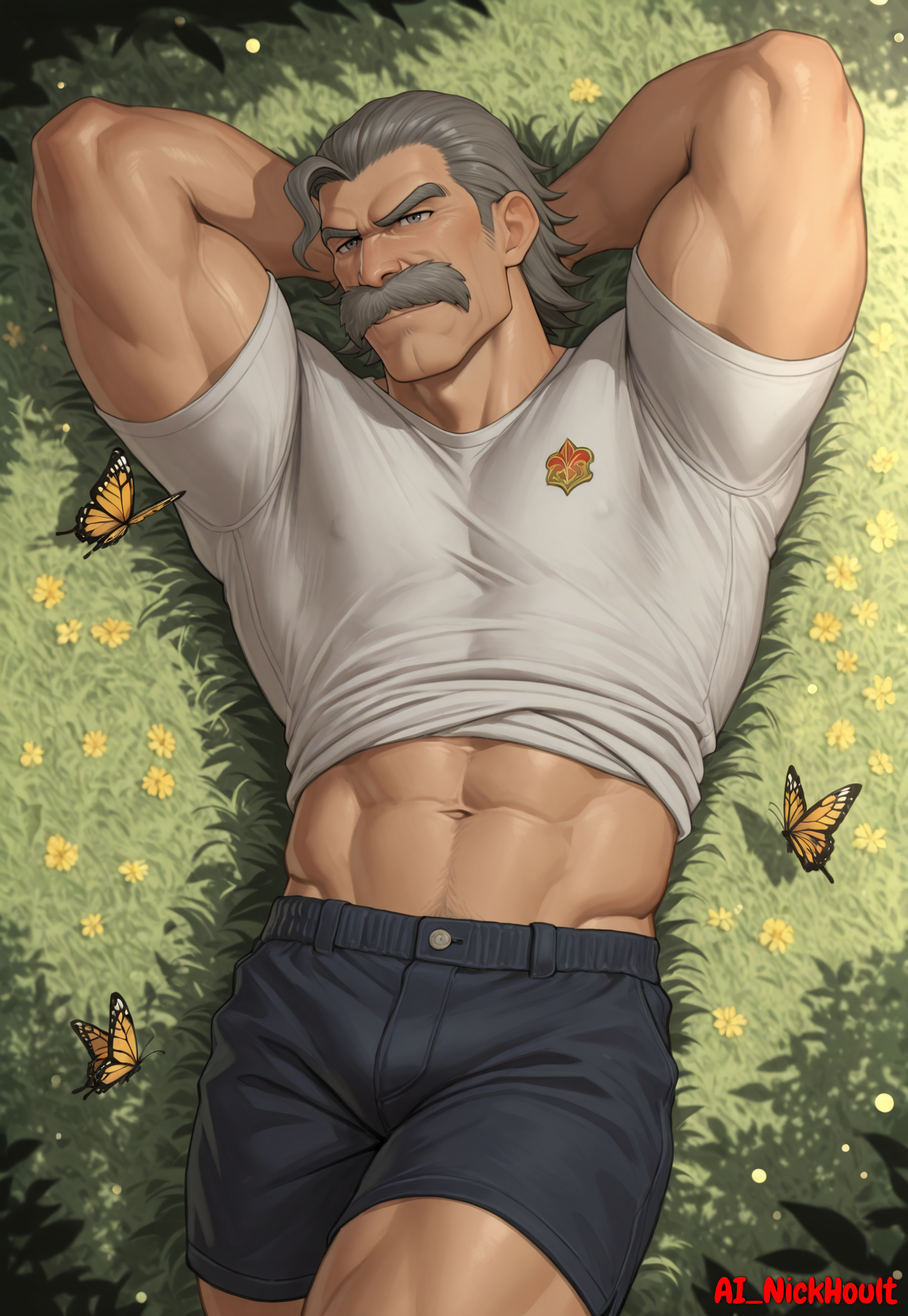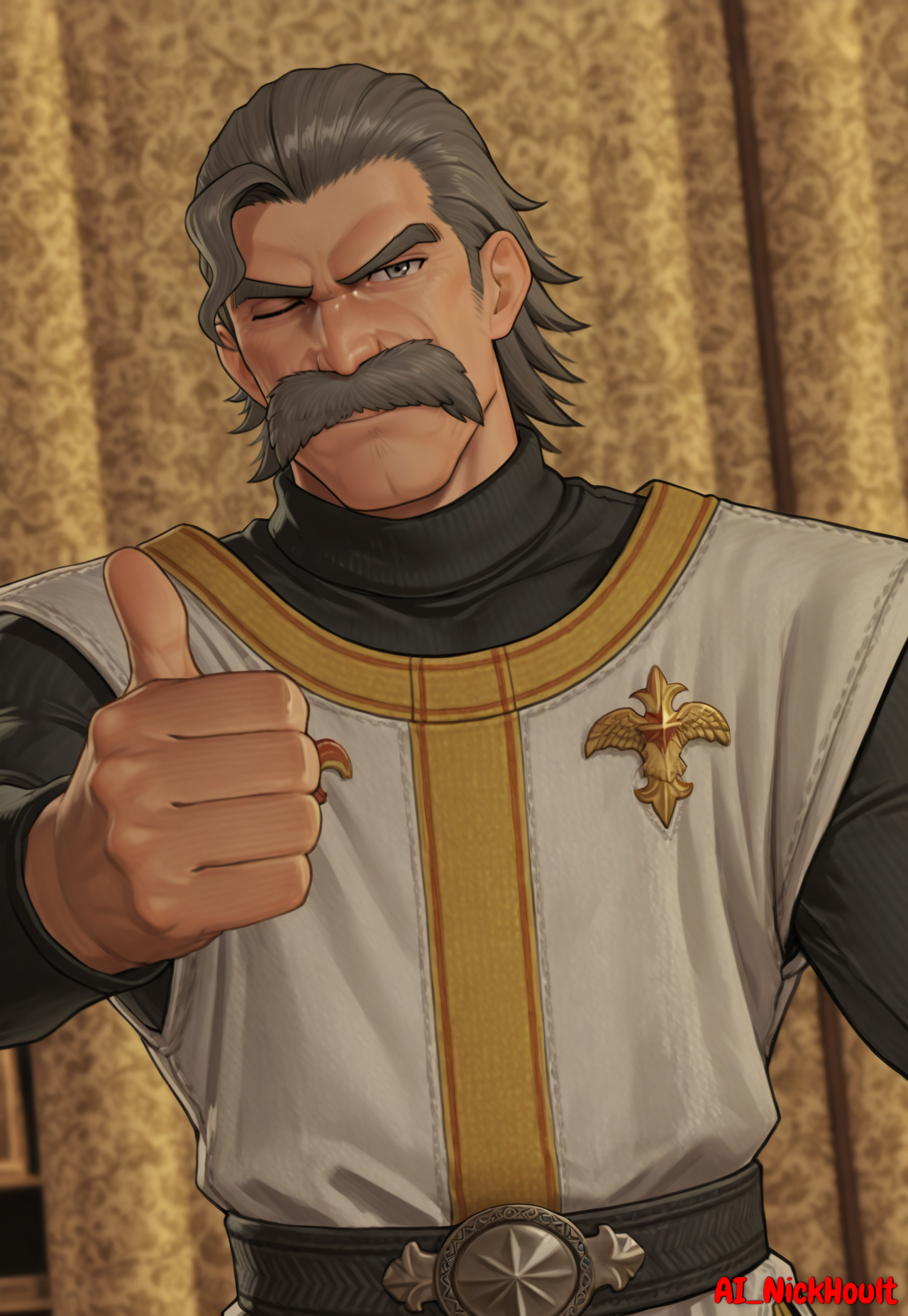 Rodrigo、老年男性、灰色の目、筋肉質な体格、灰色の髪、短髪、後ろに分けた髪、顔の髭、濃いひげ、太い眉、