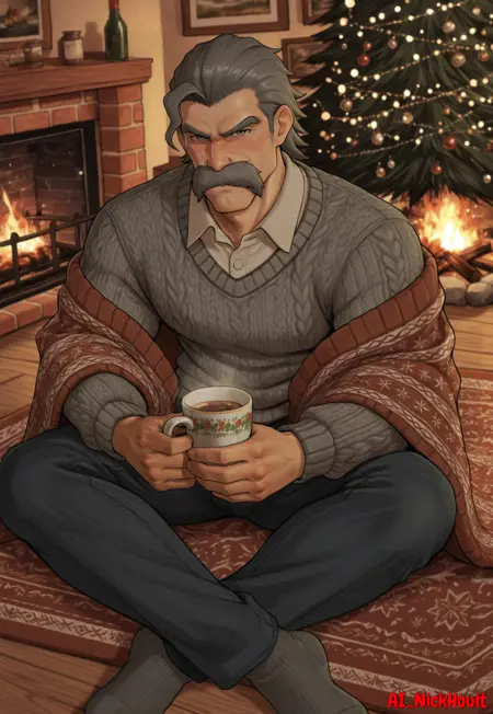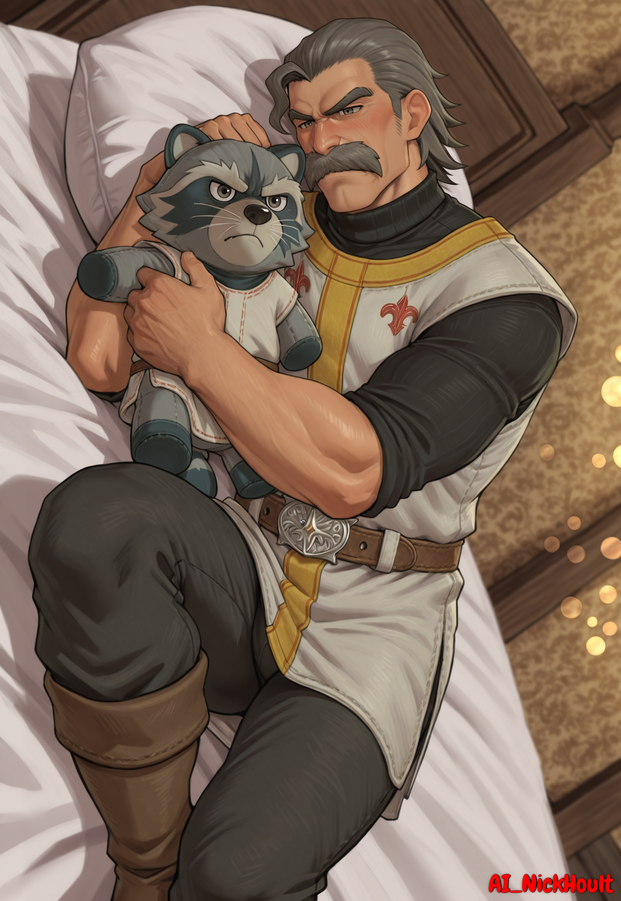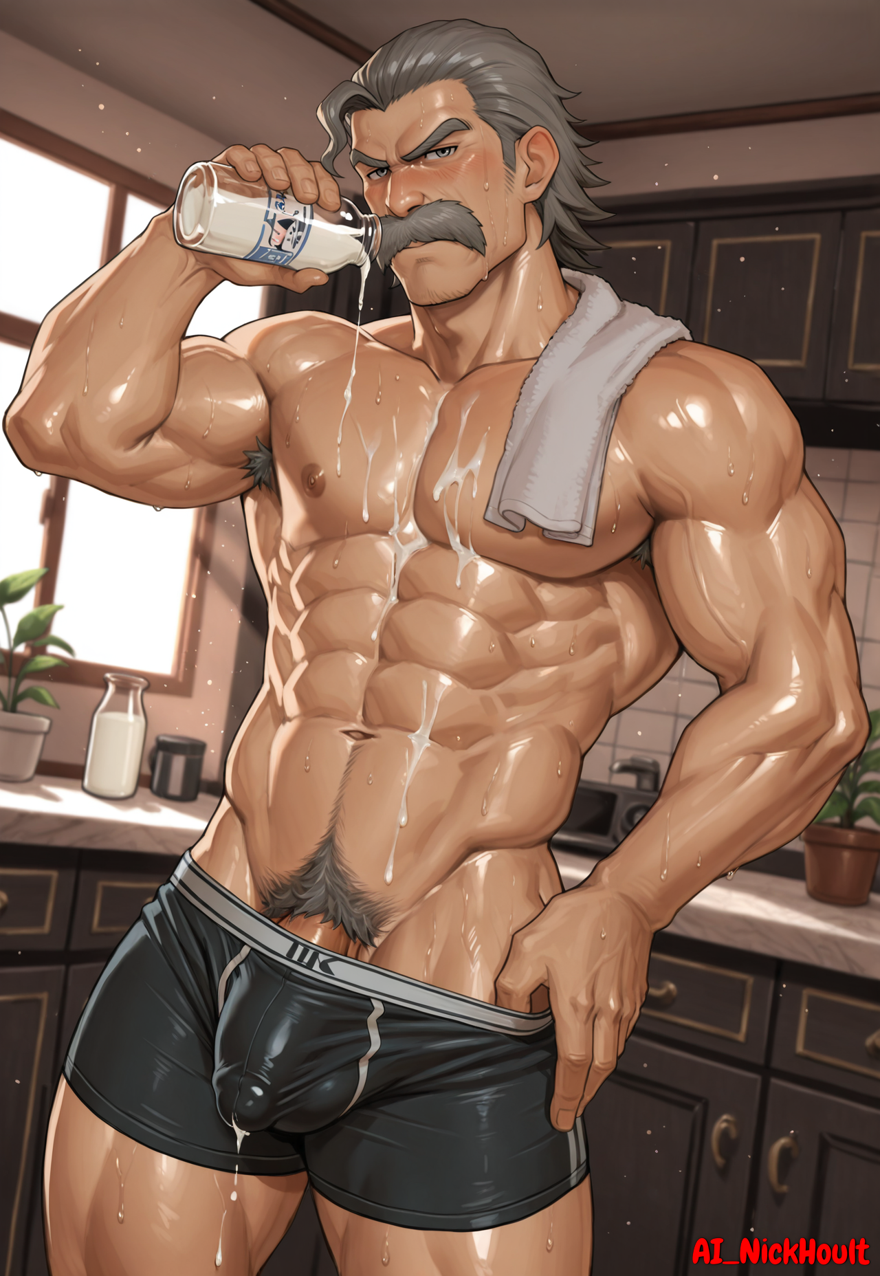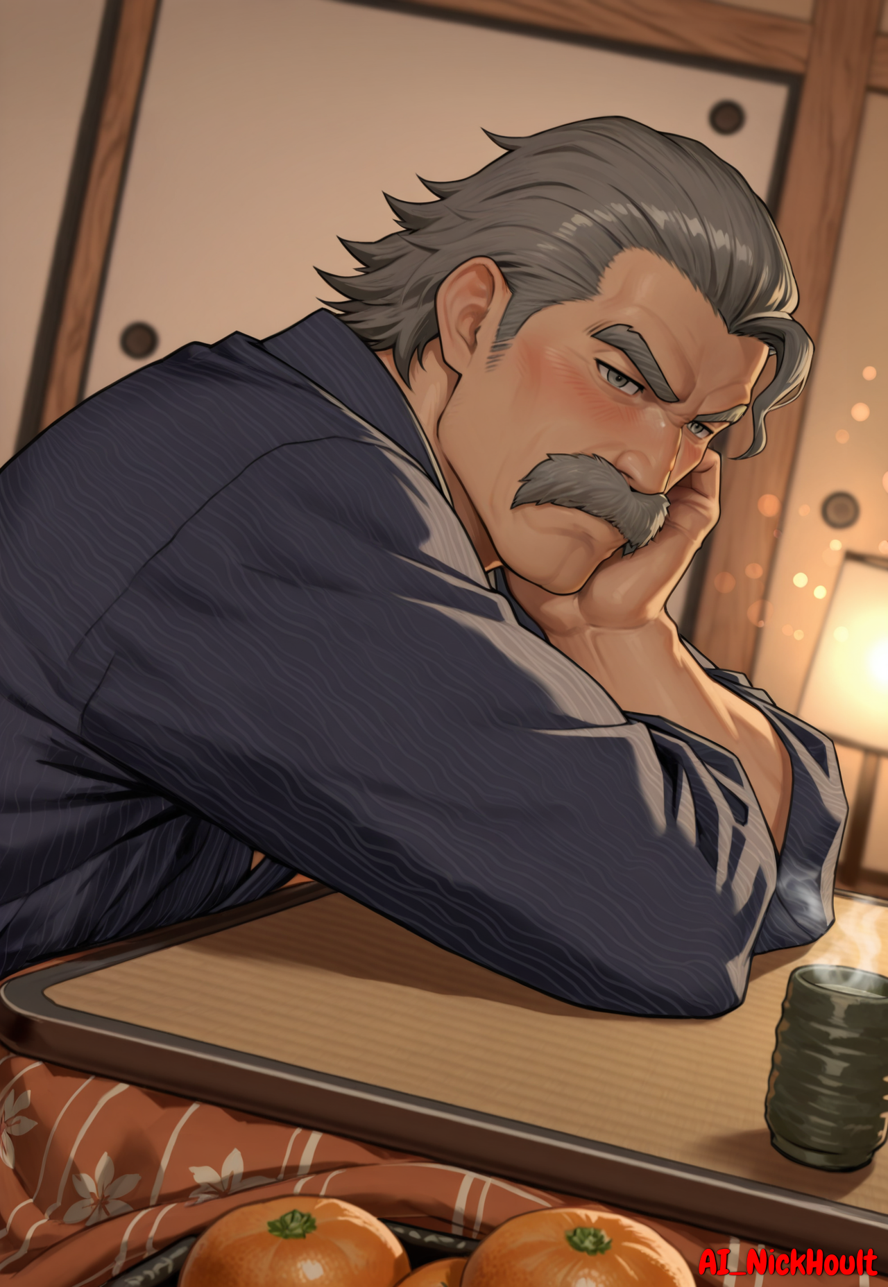 Rodrigo、老年男性、灰色の目、筋肉質な体格、灰色の髪、短髪、後ろに分けた髪、顔の髭、濃いひげ、太い眉、