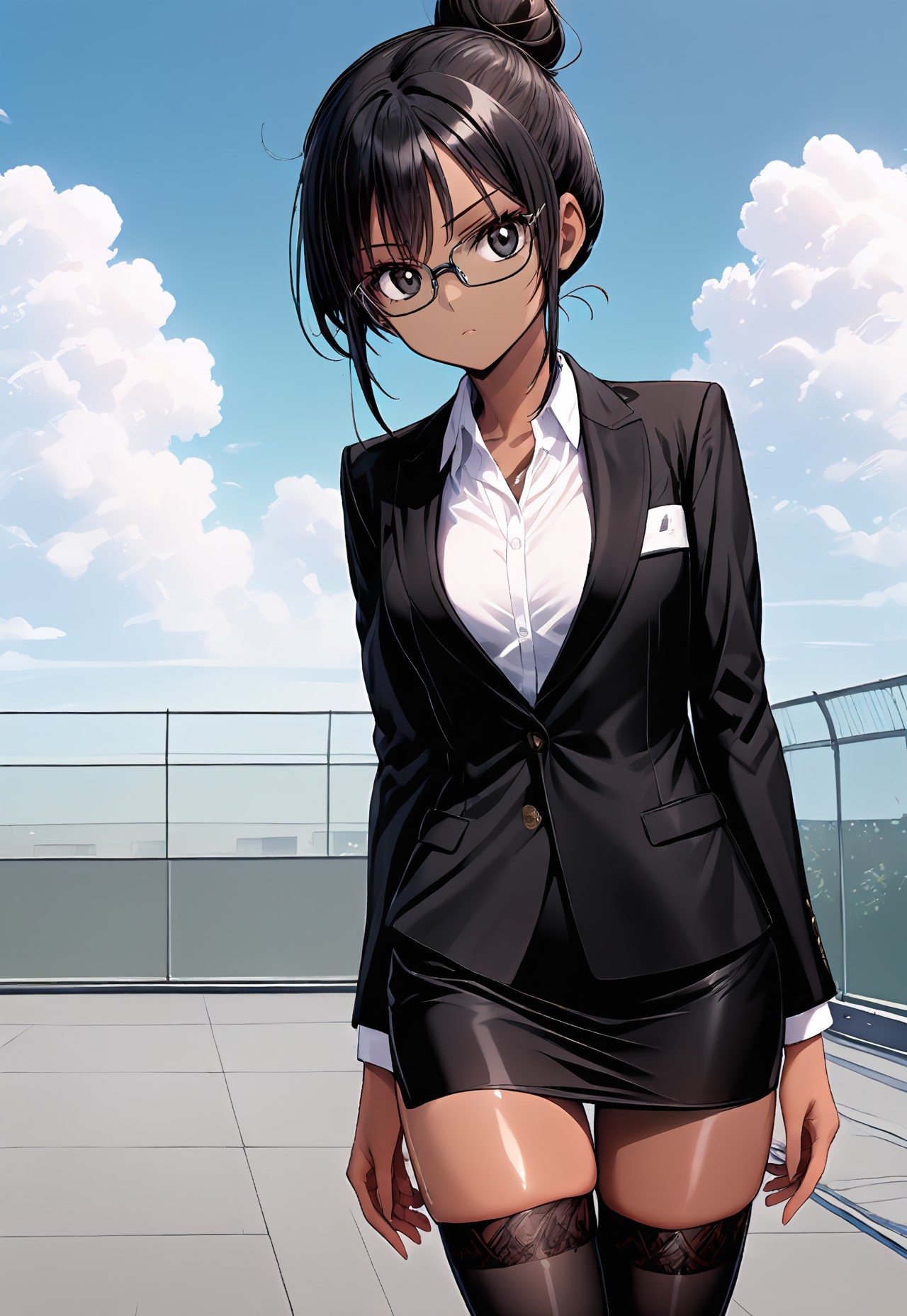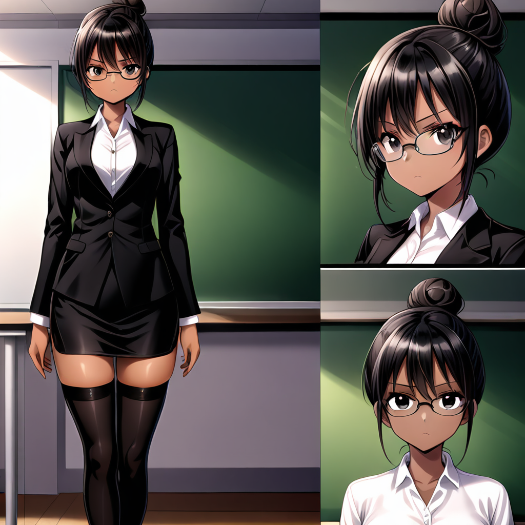 基本プロンプト: ms cecilia (hot teacher), tan-skinned female, tanned skin, serious, stern expression, black eyes, black hair, hair bun, glasses, black suit, white collared shirt, micro thong, black thighhighs, high heels