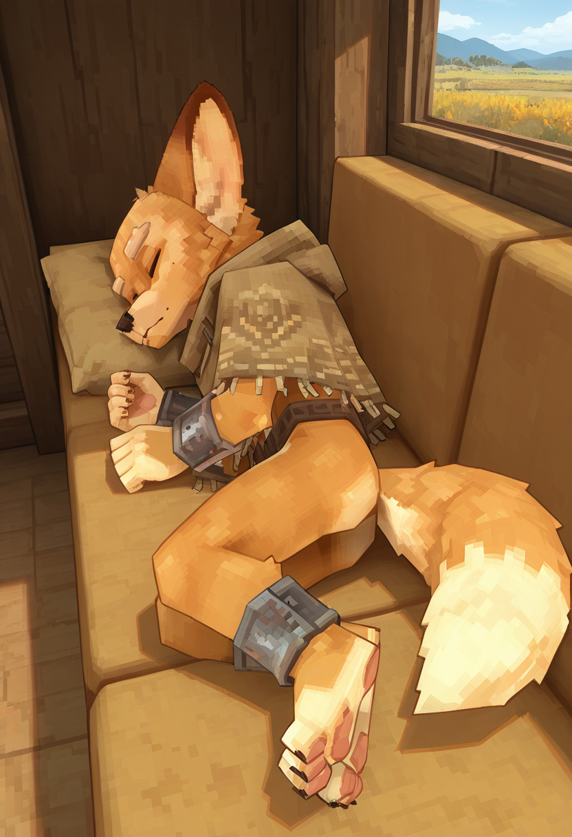 トリガーワード: Feran3, 大きな耳, 鼻先, もふもふの尾, 布のポンチョ, 金属の腕輪, 狐の少年, ファジー, アンソロ, ファー,