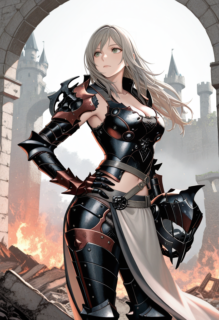 "AR4NHWFF, 회색 머리카락, 녹색 눈, 사이드락, 다중 묶인 머리카락, 분리된 소매, 어깨 갑옷, 팔 갑옷, 정강이 갑옷, 갑옷, 가슴 선, 배꼽, 허리 망토, 다리 갑옷"