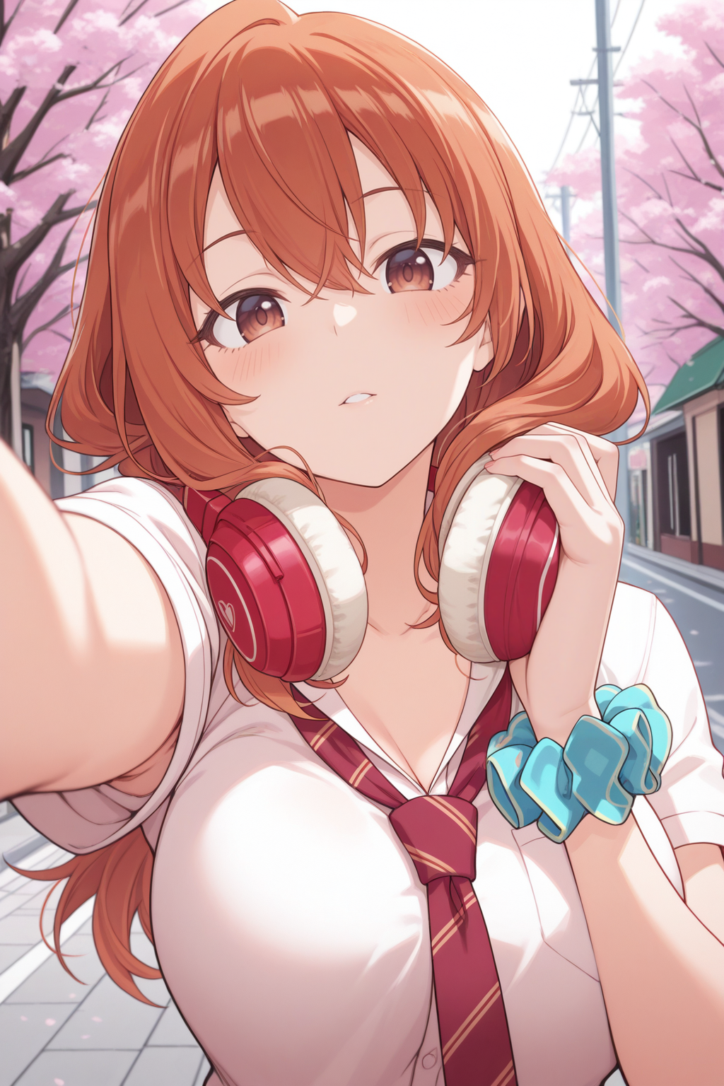 iroha_school, 칼라 셔츠, 손목 스트런치, 칼라 셔츠, 헤드폰을 목에 걸고