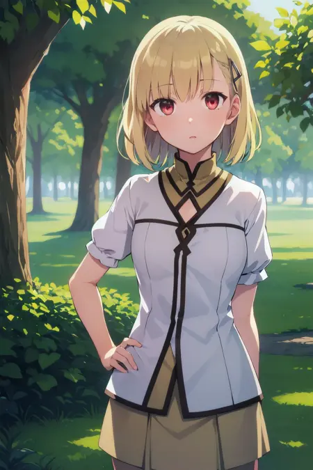プロンプト:rosetta1、金髪、赤い目、ストレートな前髪、ヘアクリップ
