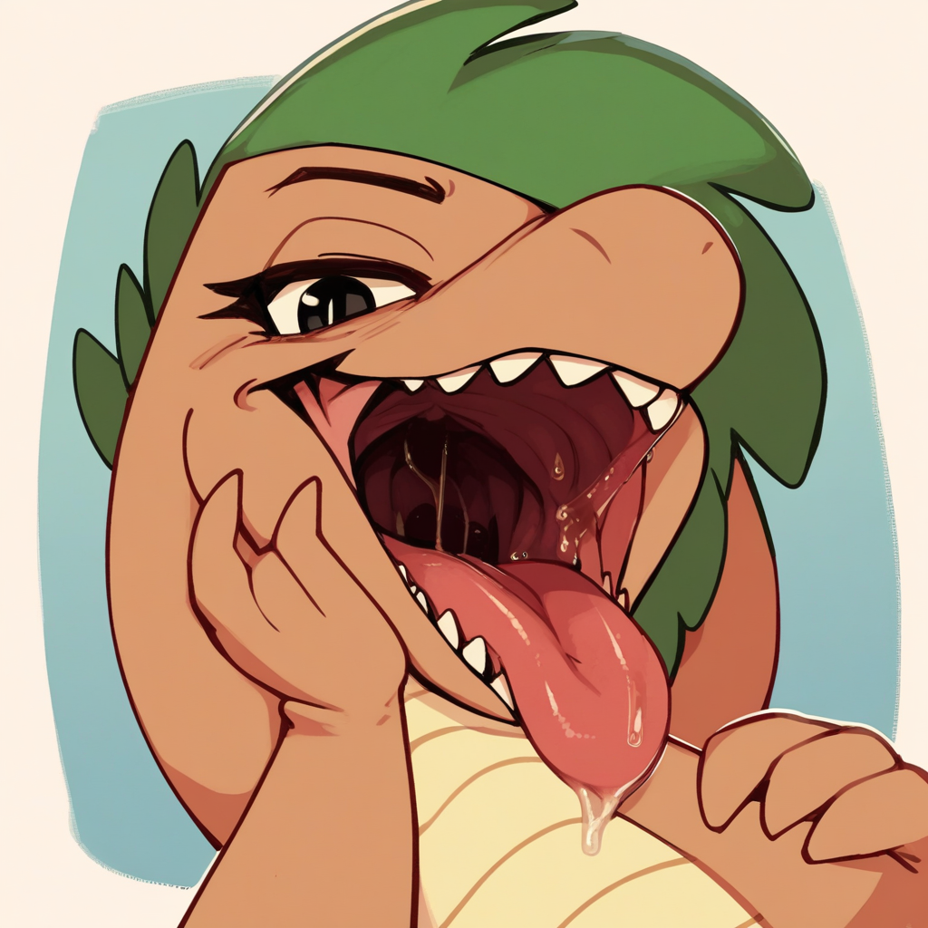 dragon, brown scales, two-toned skin, black eyes, green hair, floppy ears, dragon tail, fat, chubby