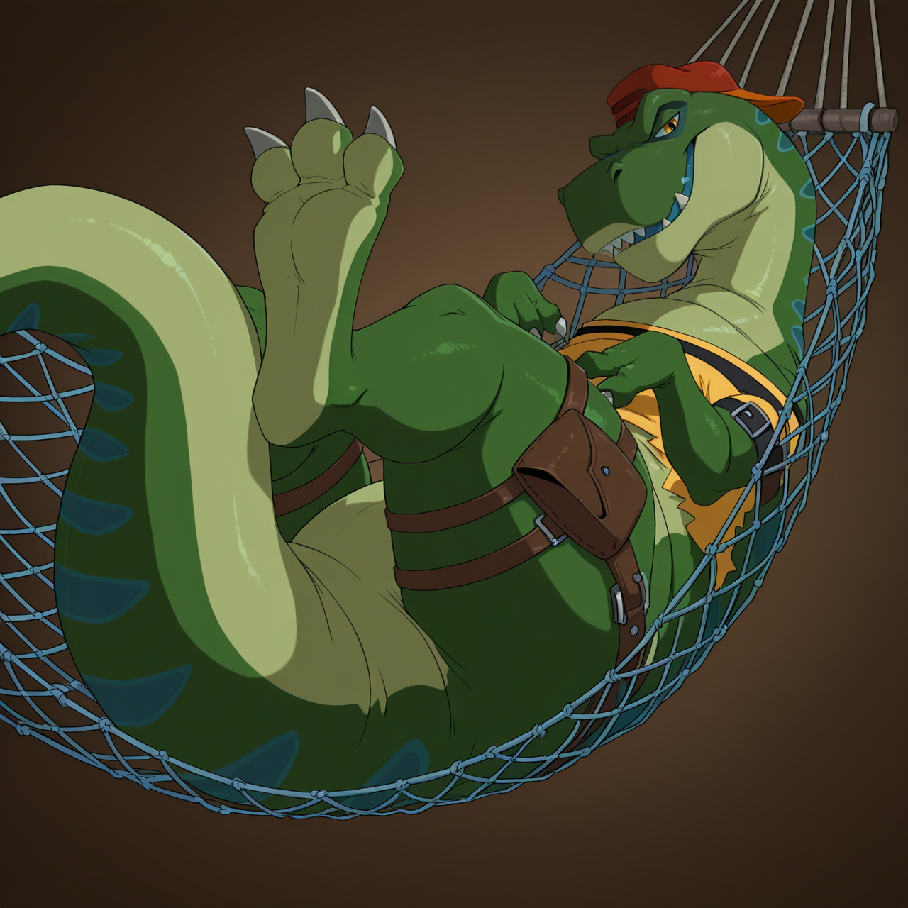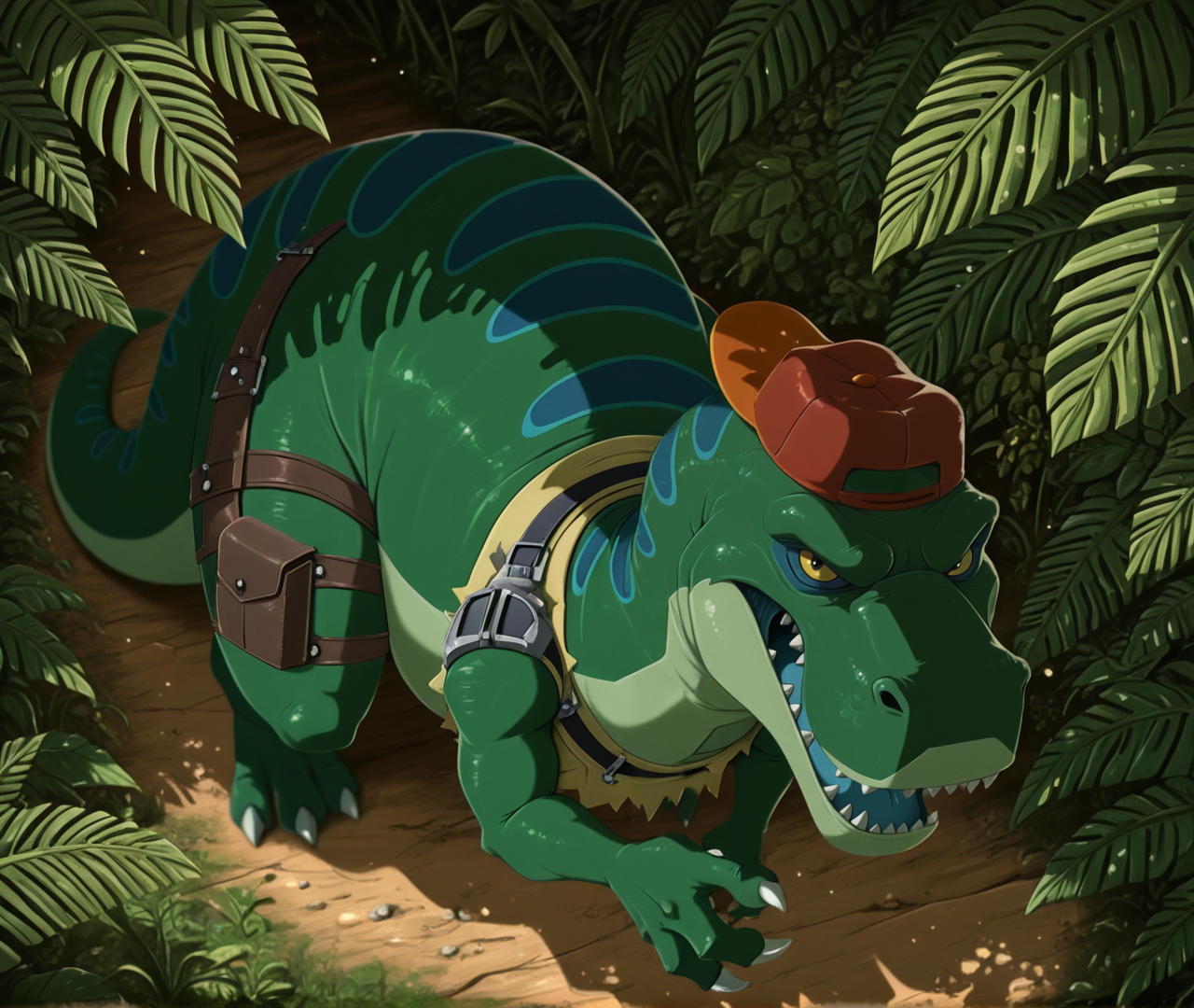 강화 요소: 뒤집어쓴 모자, 비늘, 빨간 모자, 야생적, 옷, 공룡, 사첼, 총집, 모자, 발톱, 노란 눈