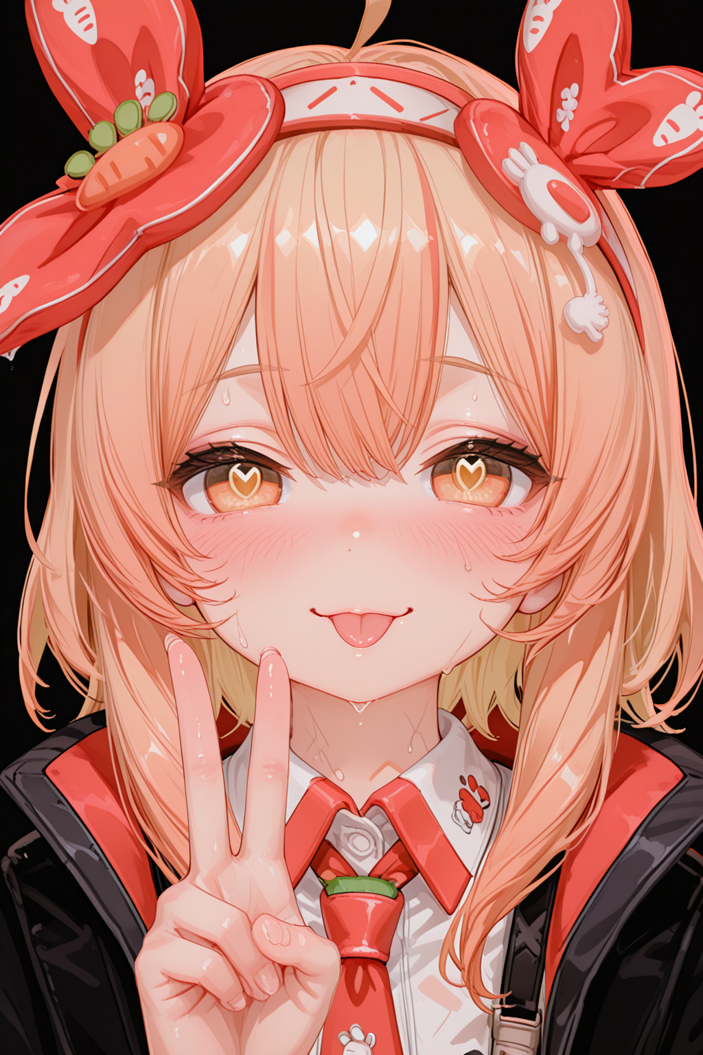 권장 프롬프트: Carrot\(Tower of Fantasy\), 1girl, solo, black background, looking at viewer, portrait, simple background, straight-on, smile, food-themed hair ornament, symbol-shaped pupils, closed mouth, heart, masterpiece, best quality, amazing quality, highres, absurdres, newest, very awa, 1girl, ahoge, black jacket, blush, collared shirt, dress shirt, jacket, parted bangs, shirt, simple background, solo, tongue, tongue out, upper body, v, white background, white shirt, wolf cut