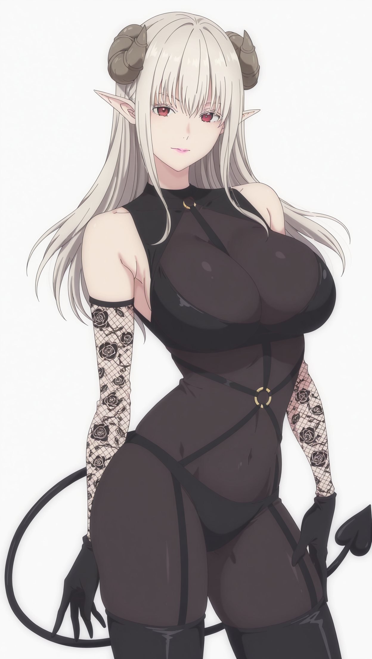 anime coloring, masterpiece, best quality, amazing quality, lust4l0tt3, 1girl, long hair, silver hair, red eyes, large breasts, curled horns, pointy ears, bodysuit, black bodysuit, bare shoulders, detahced sleeves, lace sleeves, gloves, black gloves, o-ring, panties, black panties, garter straps, thigh boots, black footwear, demon tail, tail, solo, pose, standing, looking at viewer, from front, ((((white background, simple background))))