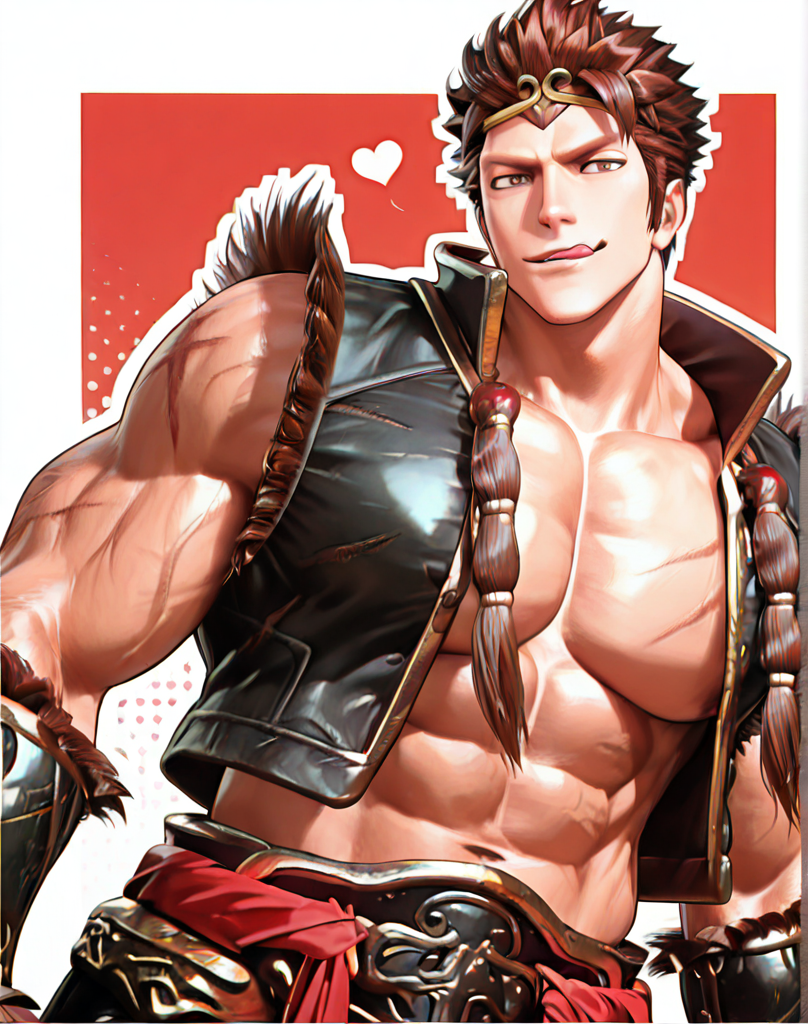 팔 없는, 어두운 장갑, 빨간 띠, 열린 검은 가죽 조끼