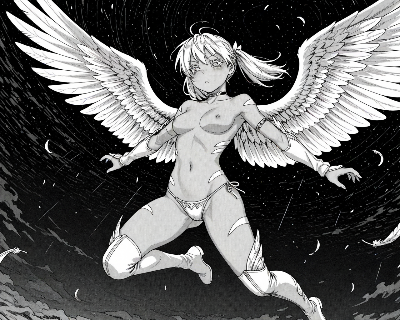 그녀의 복장: 몸 장식, 상의 없음, 티롱, 흰 날개, 흰 깃털 허벅지 부츠, 흰 깃털 팔찌,