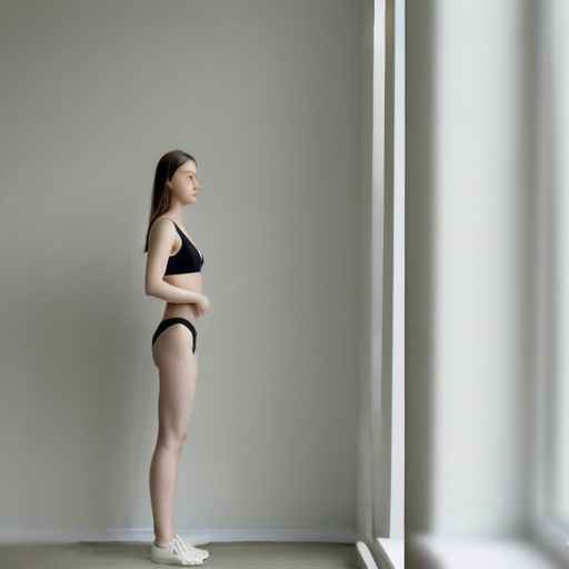 그녀의 긴 곧은 갈색 머리는 풀어헤치고 깔끔하게 중앙으로 갈라져 있으며, 그녀의 미니멀하고 우아한 외모를 잘 보완한다. 그녀는 날씬하고 운동적인 체형으로 균형 잡힌 비율과 명확한 허리선을 가지고 있으며, 자연스럽고 이완된 자세를 취하고 있다.