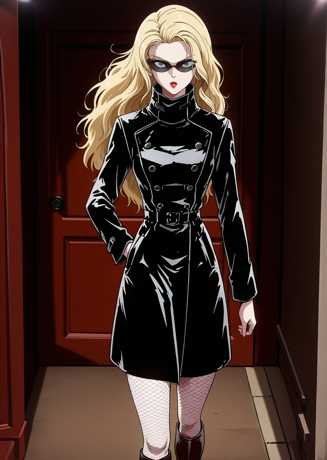 valkyriaforsberglisker, 1girl, solo, long hair, blonde hair, blue eyes, red lips, sunglasses, pantyhose, boots, fishnet pantyhose, black coat, trench coat, knee boots