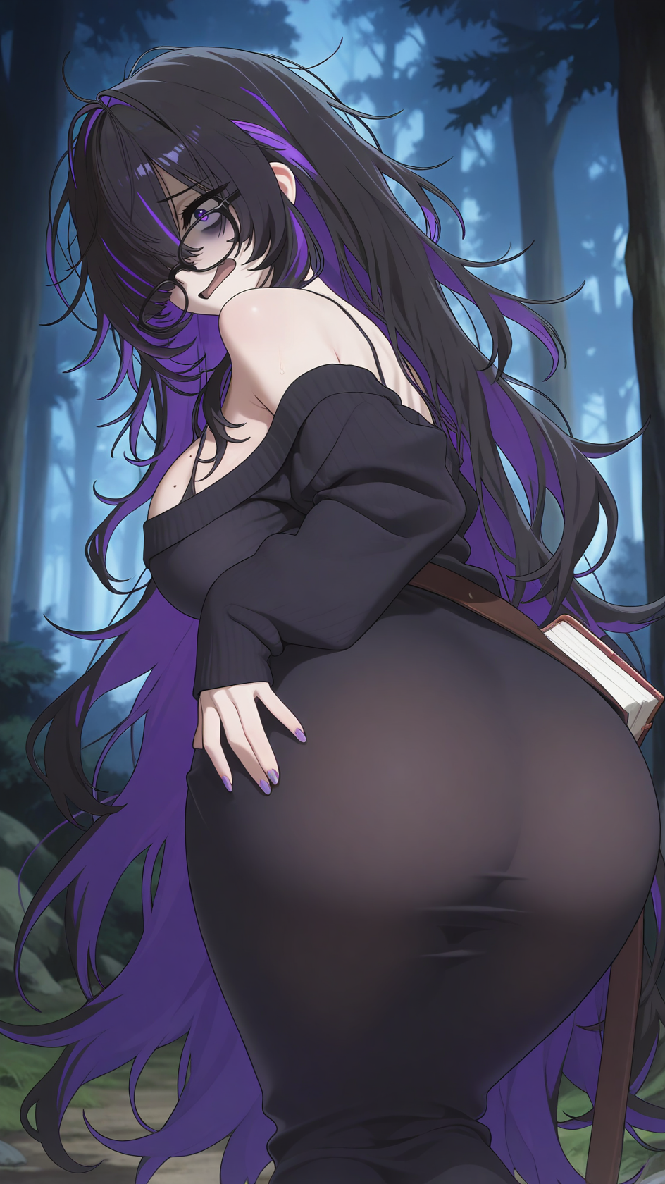 예시 프롬프트: 앞머리, 큰 가슴, 검은 머리카락, 매우 긴 머리카락, 보라색 눈, 보라색 머리카락, 한쪽 눈 위의 머리카락, 다채로운 머리카락, 가슴에 주근깨, 어수선한 머리카락, 색상이 있는 안쪽 머리카락, 보라색 손톱, 눈 아래 다크서클, 이색 머리카락,