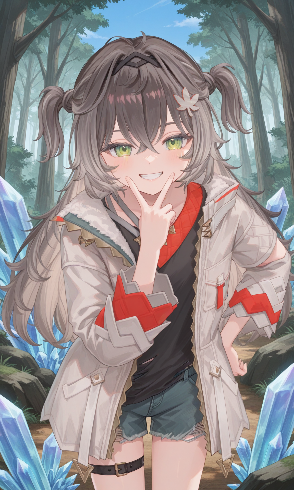 tatsum4ki chise, long hair, two side up, hair ornament, hairband, o-ring choker, beige jacket, long sleeves, black shirt, fingerless gloves, torn clothes, blue shorts, denim shorts, thigh strapbeige jacket, long sleevesを削除し、short sleevesを追加できます。hornsを追加できます。