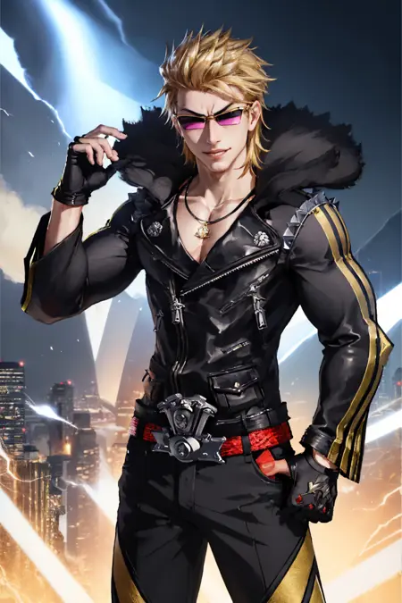 ライダー: sakatarider, サングラス, バイカー服, レザージャケット, ファー縁取り, ブラックグローブ, ブラックパンツ, ネックレス