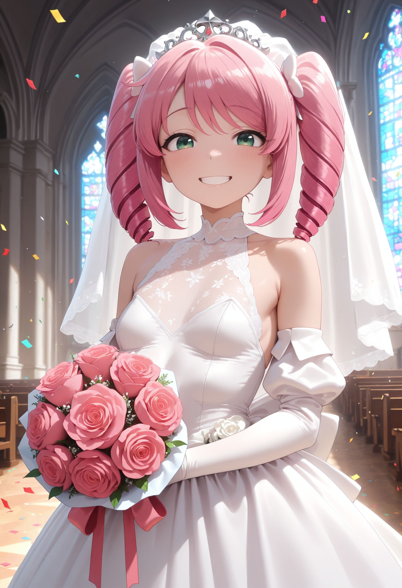 Trigger: 1girl, solo, long hair, medium hair, twintails, twin drills, drill hair, pink hair, green eyes