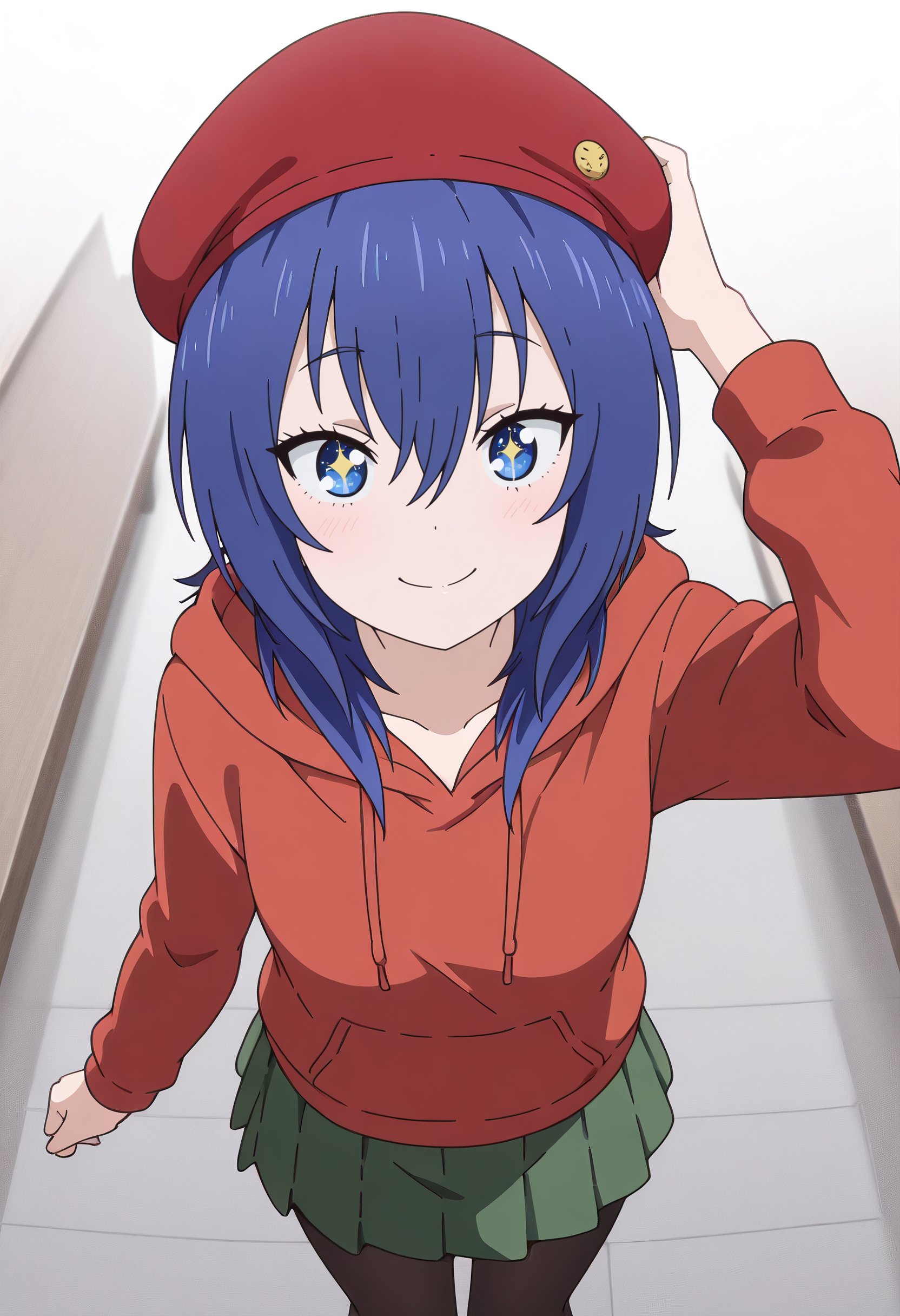 ChikaSkirt, hood, hoodie, hood down, hat, beret, red hat, long sleeves, skirt, green skirt, blue hoodie, pantyhose, red headwear, black pantyhose, pleated skirt, miniskirt, casual,