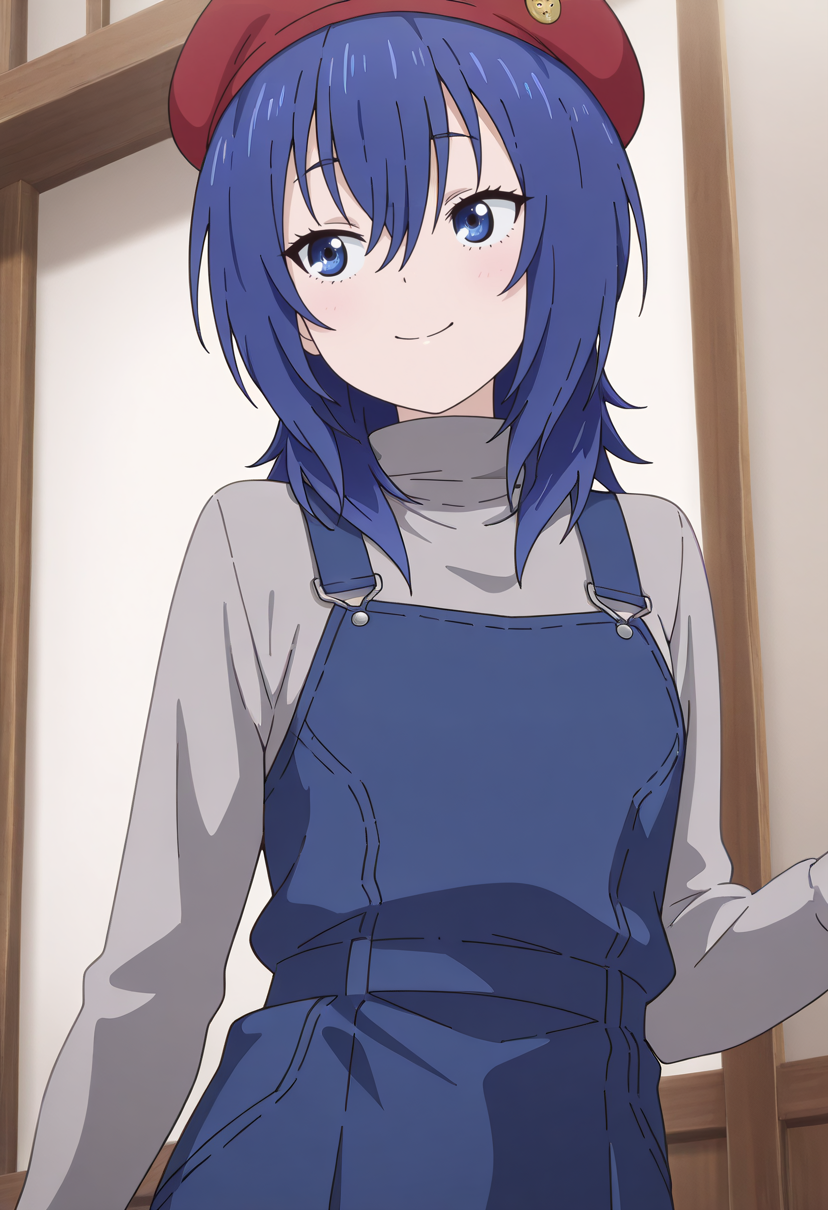 ChikaOveralls, hat, shirt, red hat, beret, sweater, turtleneck, grey shirt, overalls, long sleeves, turtleneck sweater, dress, blue dress, pinafore dress, red headwear, tilted headwear, sleeveless dress, overall skirt, blue overalls,