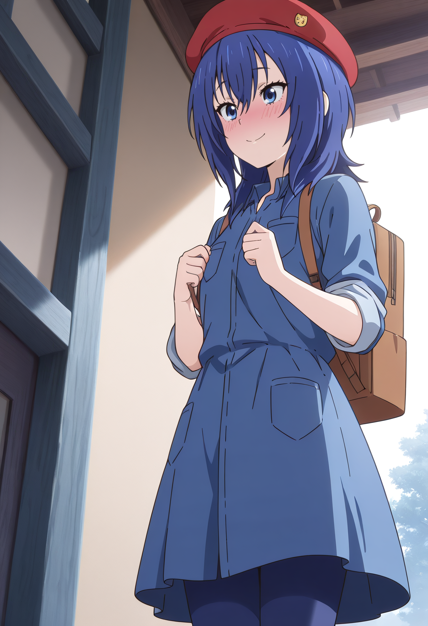 ChikaDressB, hat, beret, red hat, shirt, red headwear, blue shirt, collared shirt, sleeves rolled up, pocket, breast pocket, coat, blue dress, pantyhose, red pantyhose, dress, dress shirt,