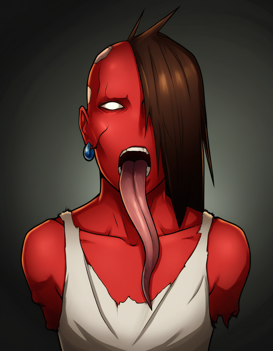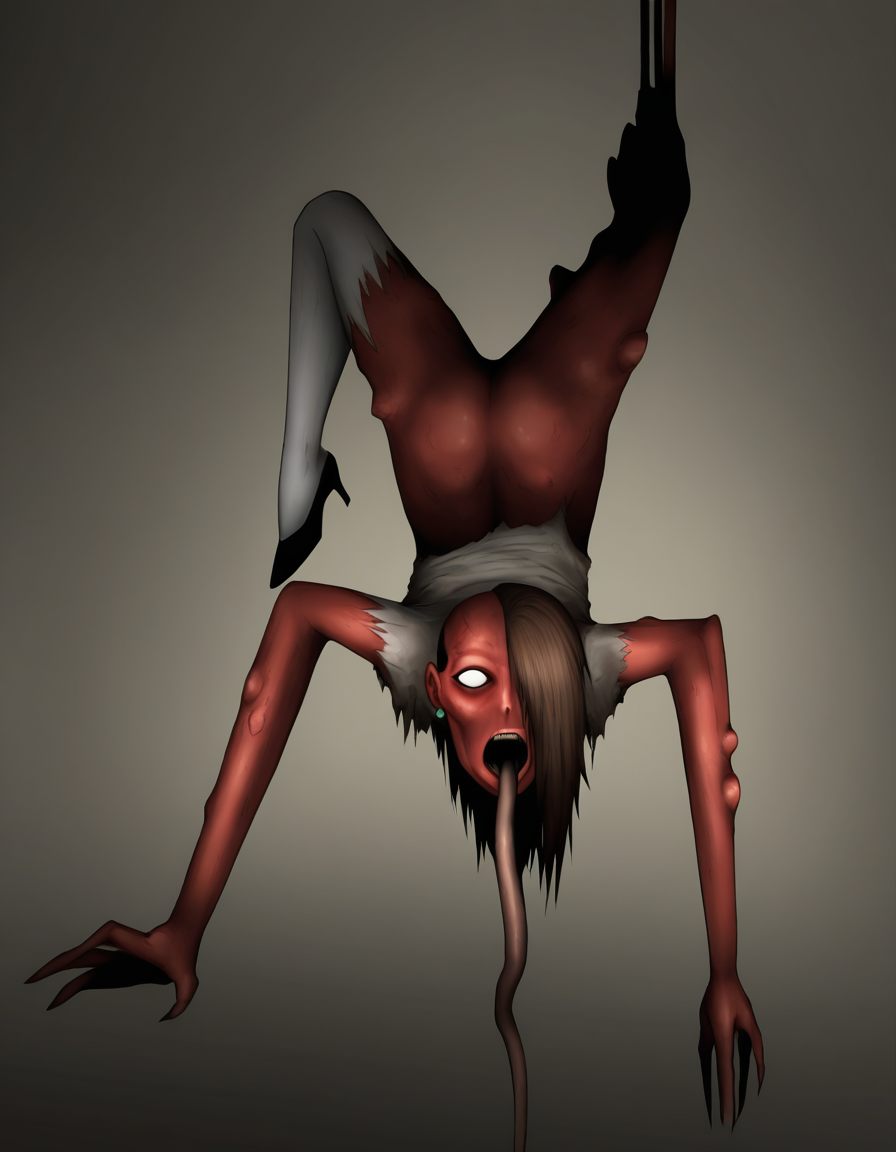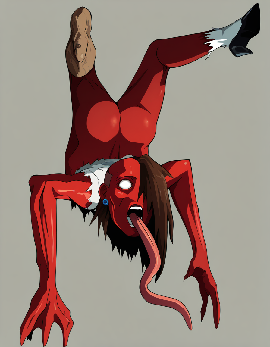 プロンプト:RegLic、逆さま、赤い肌、白い目、色付きの肌、ジュエリー、イヤリング、長い舌、片方の白いタイツ、モンスターガール、茶色の髪、サイドカット、片方の目を覆う髪、ホラー(テーマ)、何、片方の靴、黒いハイヒール、無表情、破れた白いシャツ、長い腕、鼻なし、反り返った背中、ぶら下がっている、後ろから