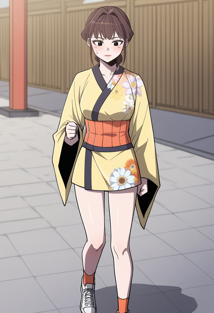| トレーニングワード | Eon Yeong, 1girl, solo, black eyes, bangs, brown hair, hair bun, single hair bun, small breast,コピーしました! casual_out, kimono, short kimono, yellow kimono, floral print, wide sleeves, long sleeves, orange socks, shoes, orange obi,コピーしました! formal_out, hair ornament, hair flower, white flower, kimono, yellow kimono, haori, floral print, sash, wide sleeves,コピーしました! |