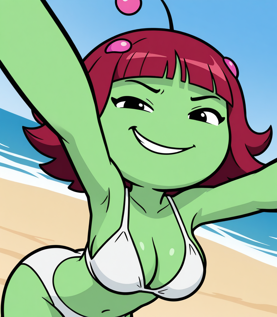 • 1girl, alien girl, solo, green skin, colored skin, dark-red hair, short hair, pink hair clips, bangs, blunt bangs, antennae, black eyes, white swimsuit, breasts, midriff, navel,