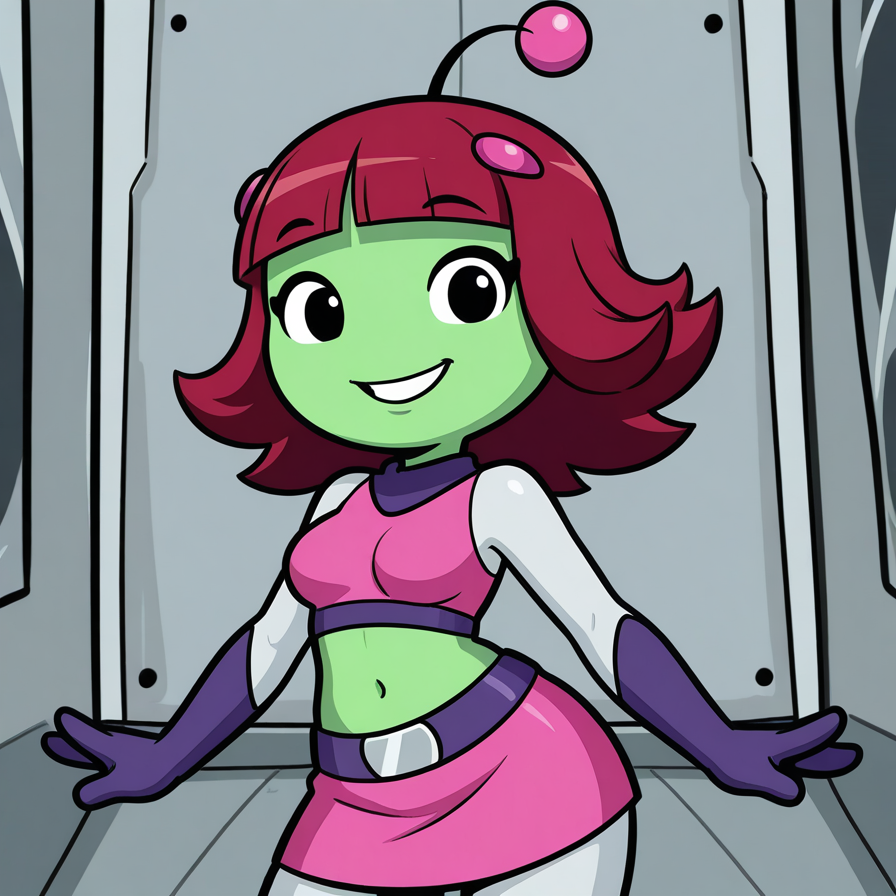 • 1girl, alien girl, solo, green skin, colored skin, dark-red hair, short hair, pink hair clips, bangs, blunt bangs, antennae, black eyes, space suit, breasts, purple gloves, midriff, navel, purple belt, pink skirt, light-grey pantyhose, purple thigh boots, thighhighs under boots,