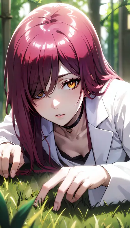 ラボコート、ロングヘア、ピンクの髪、ブラックチョーカー、黄色い目