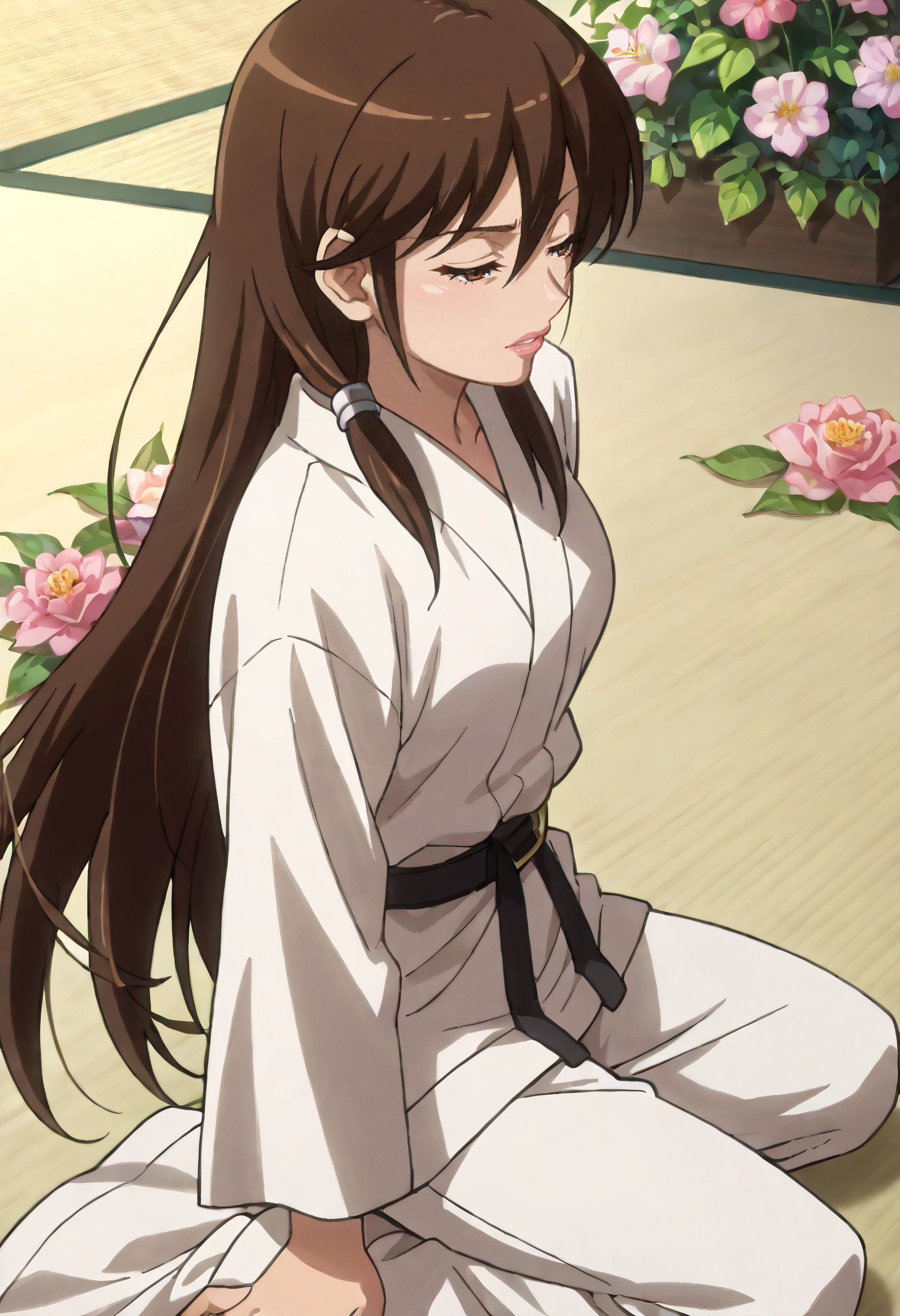 KusunokiRobe, japanese clothes, dougi, hair ornament, karate gi, white kimono, flower, martial arts belt, hair flower, kimono, belt, black belt, long sleeves, white pants, pants, hair tubes,