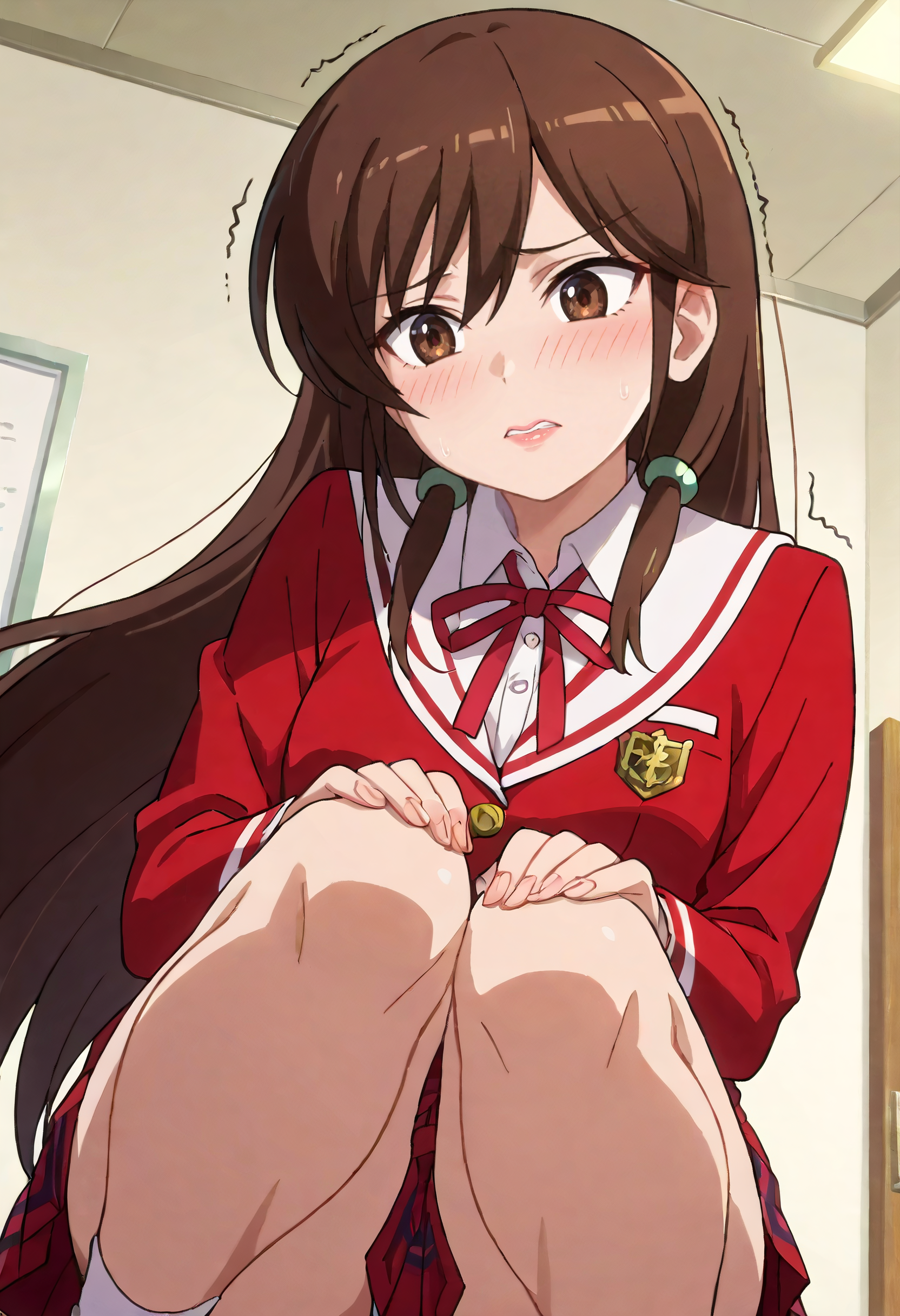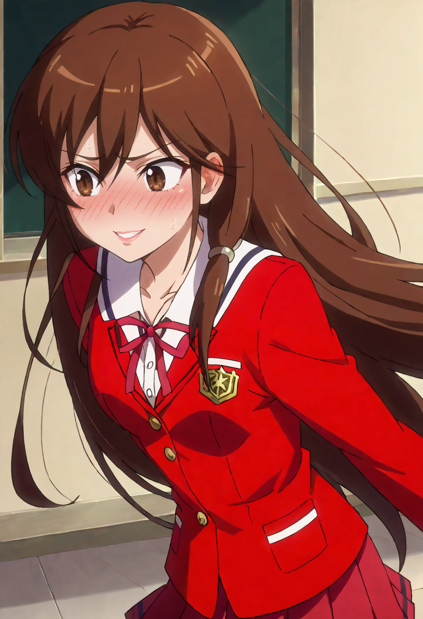 KusunokiSchool, school uniform, ribbon, jacket, long sleeves, school emblem, red ribbon, emblem, bow, shirt, hair ornament, skirt, blazer, sailor collar, neck ribbon, pleated skirt, buttons, white sailor collar, collared shirt, red jacket, red skirt,
