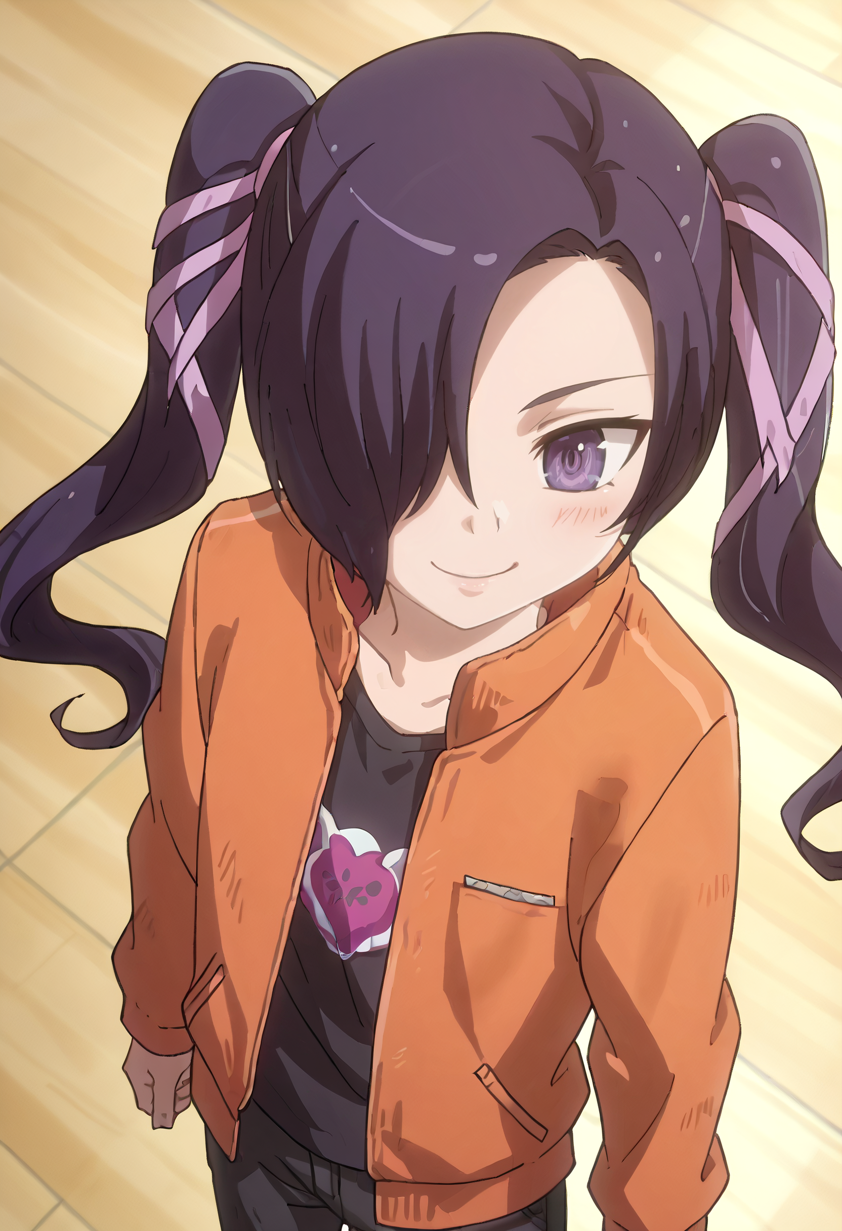 KNZAkari, 한쪽 눈 위의 머리카락, 트윈테일, 보라색 눈, 긴 머리, 검은 머리,