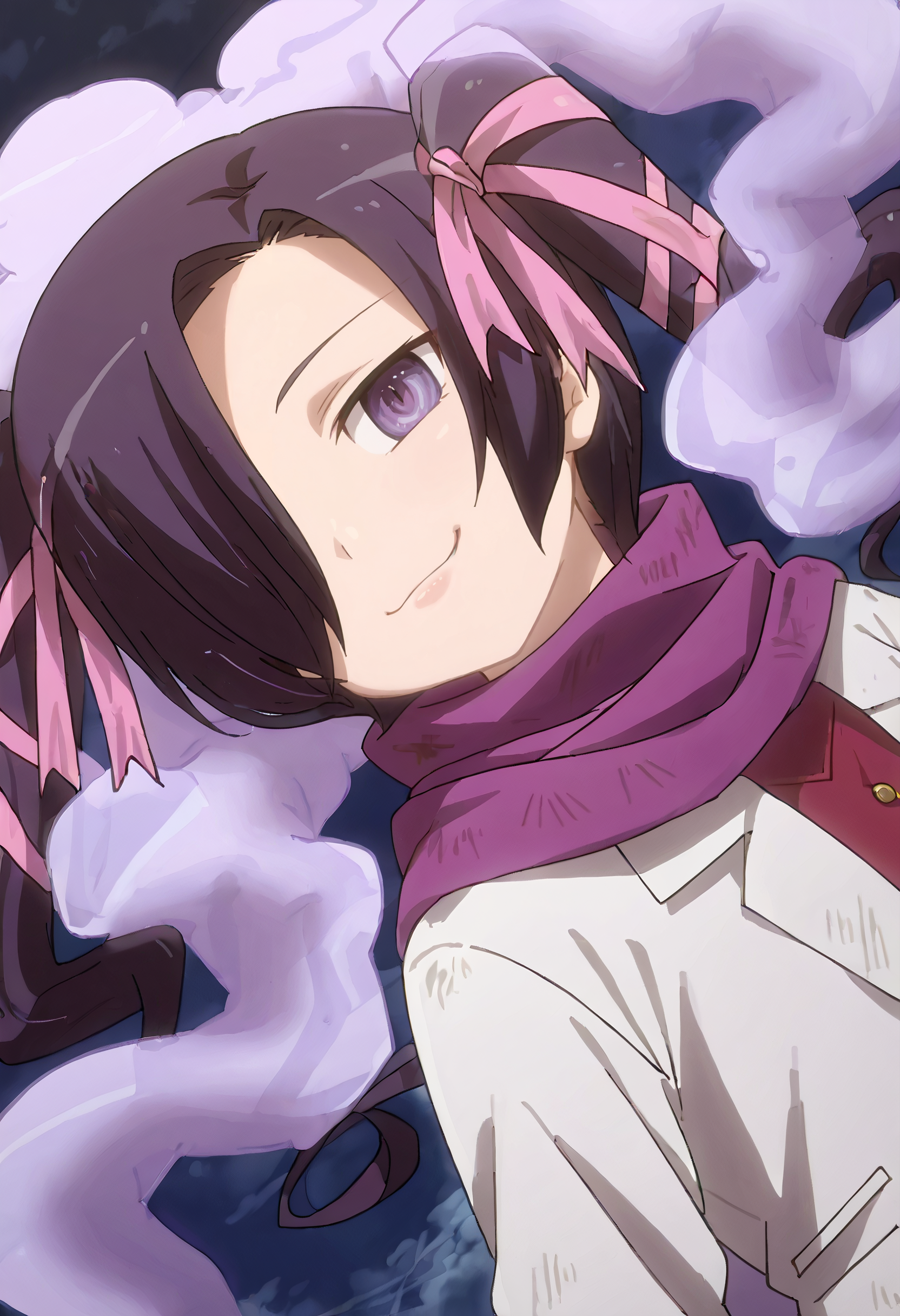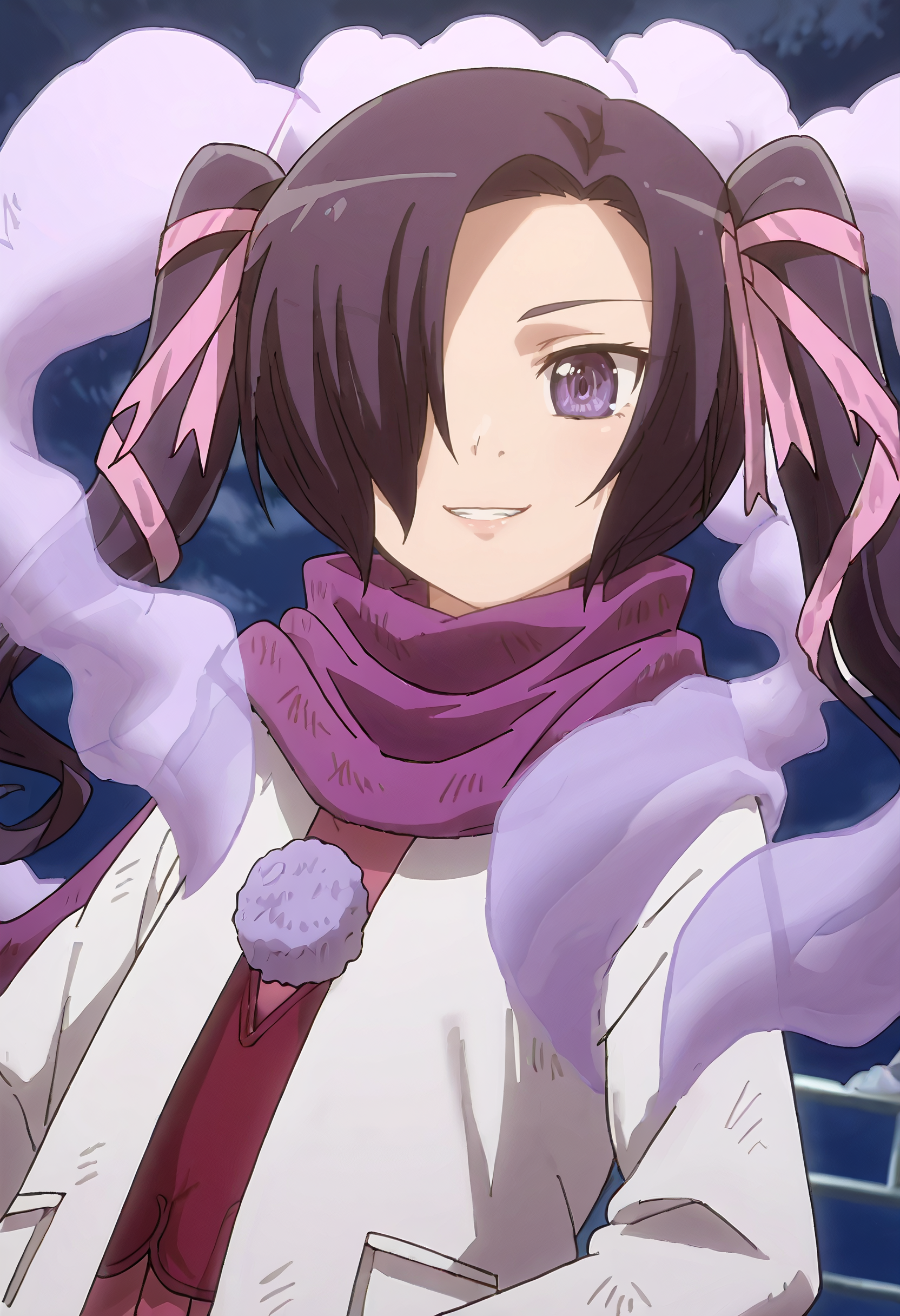 AkariOutfit, 스카프, 머리 리본, 리본, 보라색 스카프, 코트, 분홍색 리본, 샬, 하고로모, 재킷, 연기, 구름,