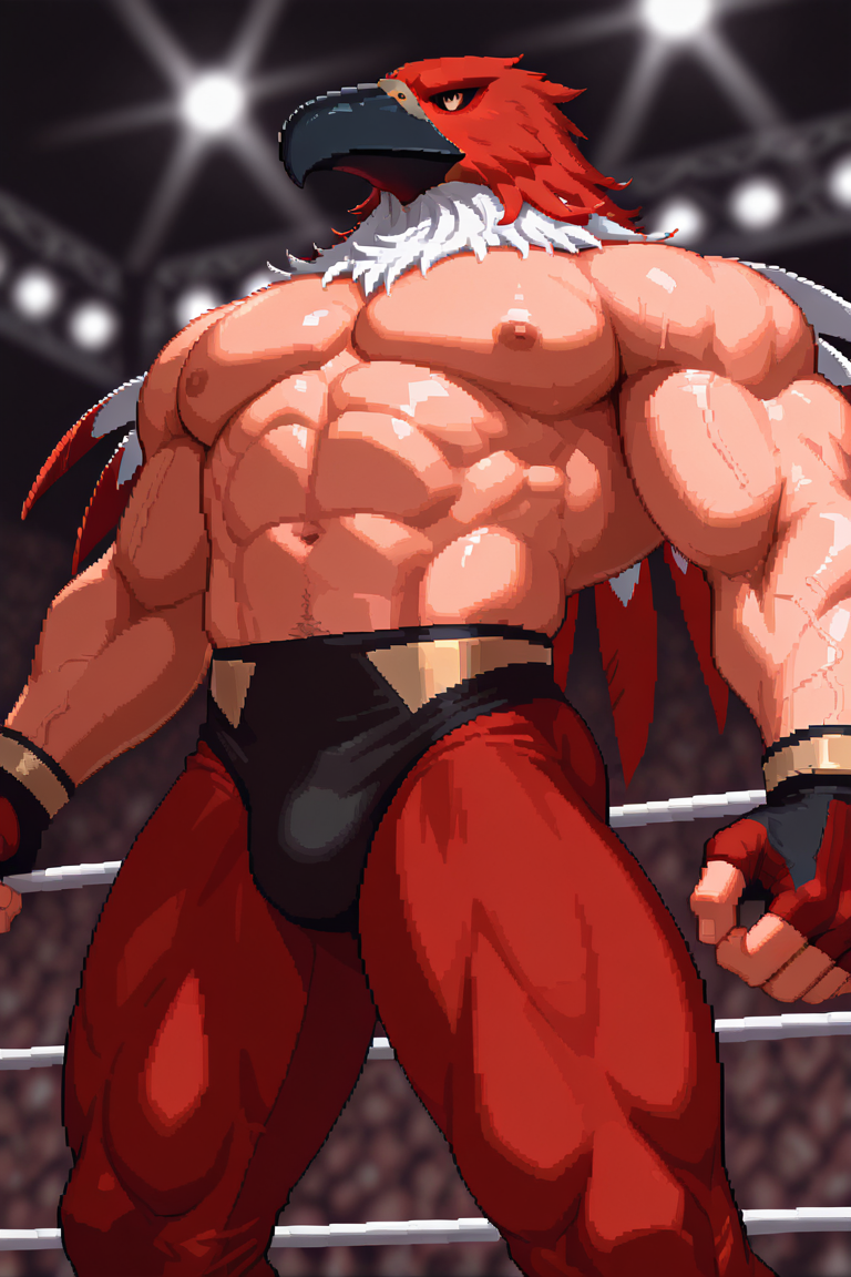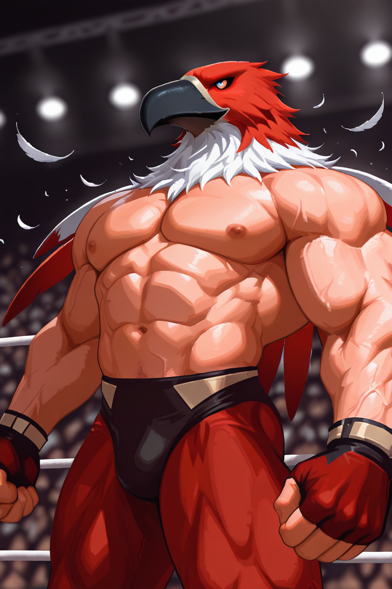 Prompt: t1z0c, manly, bird mask, wrestling suit, fingerless gloves,