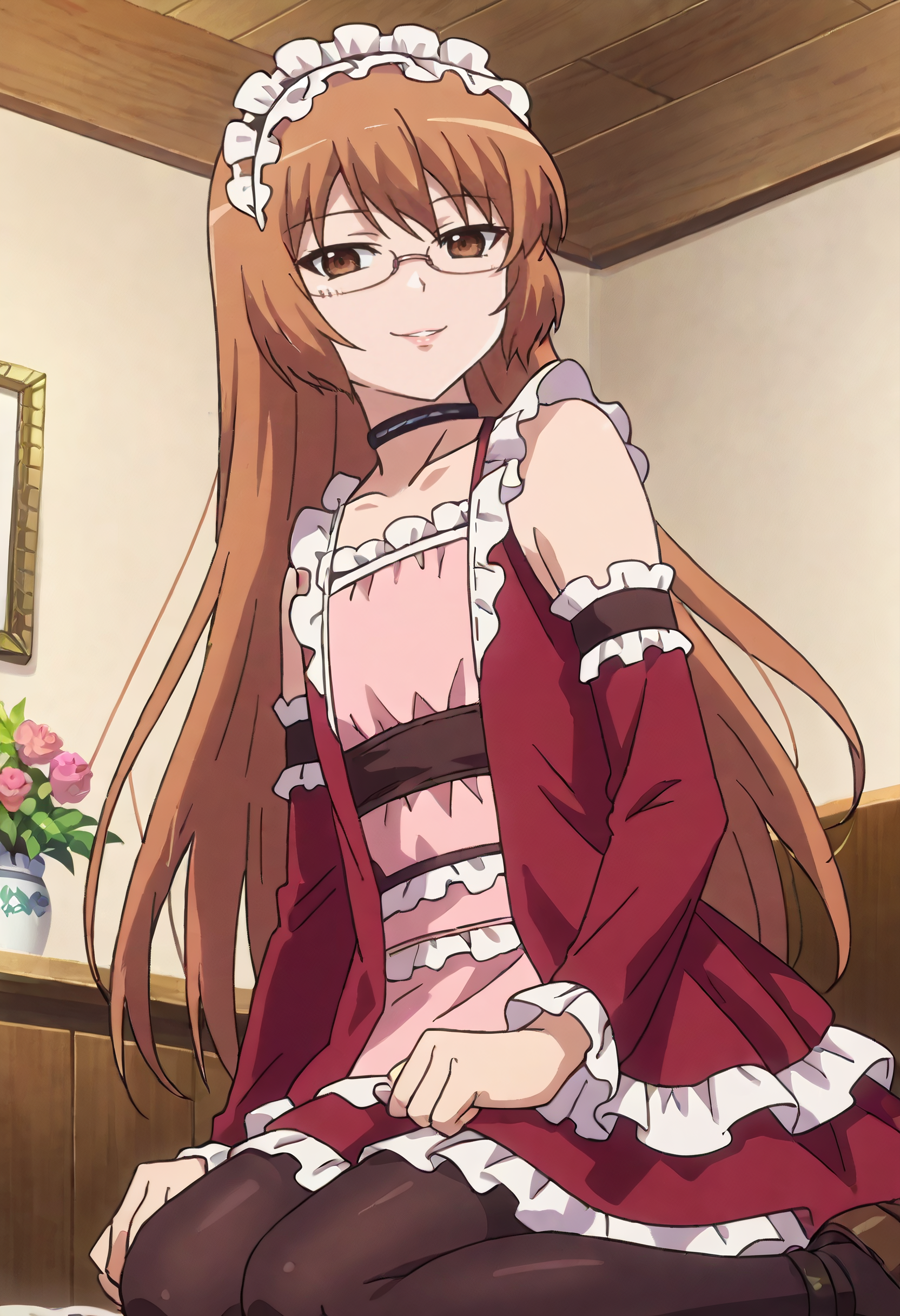 XKeimaMaid, 초커, 프릴, 메이드 헤드기어, 헤어밴드, 남자로 변장, 드레스, 분리형 소매, 메이드, 오토코노코, 팔찌, 검은 초커, 헤드기어, 긴 소매, 프릴 드레스, 프릴 헤어밴드, 팬티스타킹, 엔메이디드, 빨간 드레스,