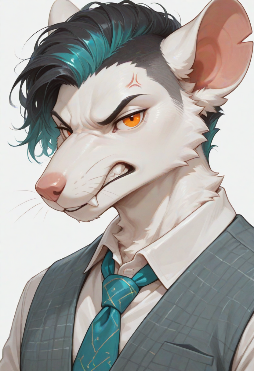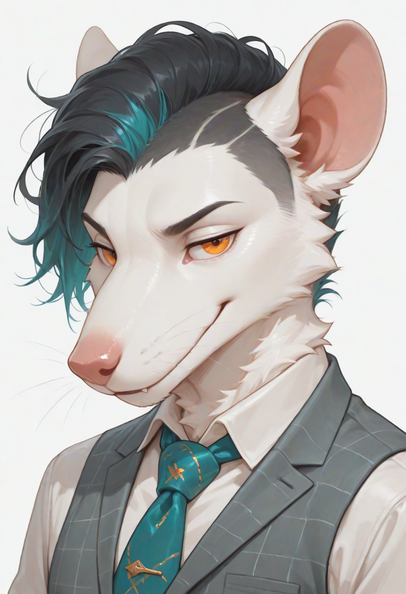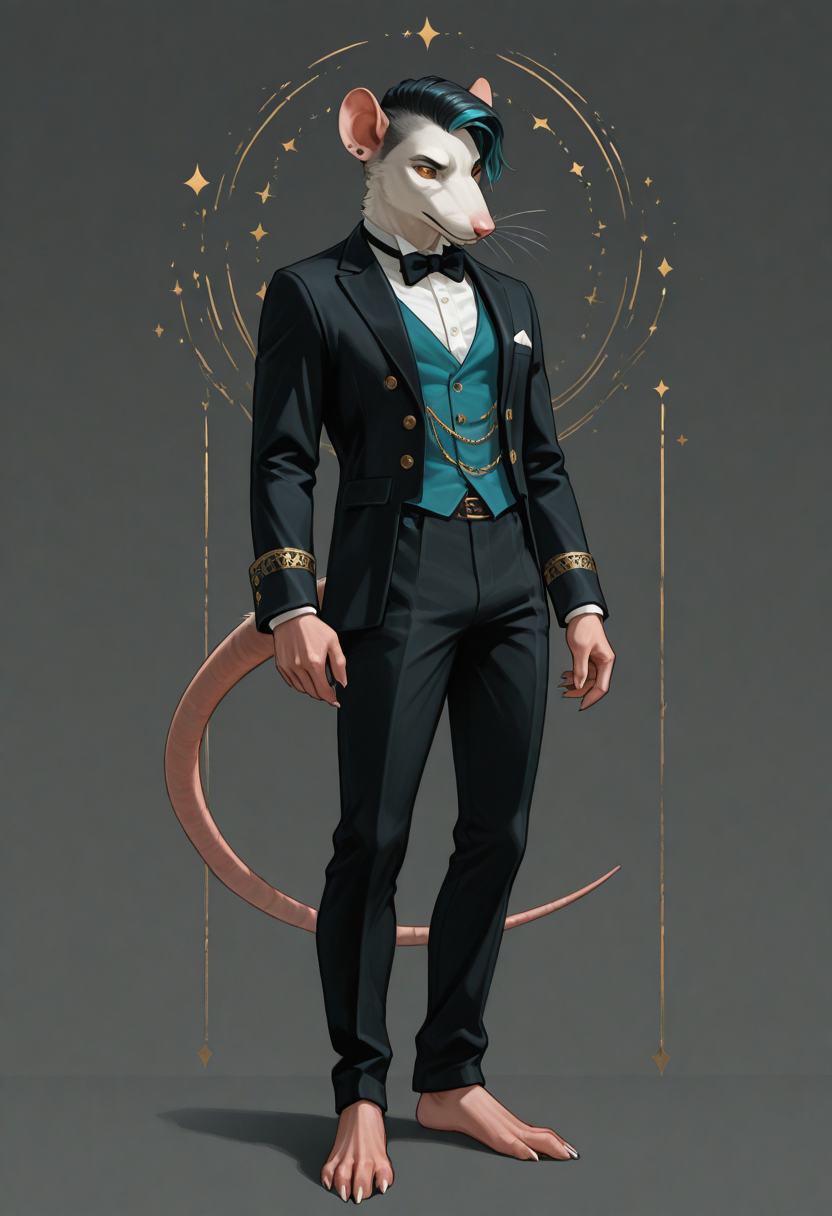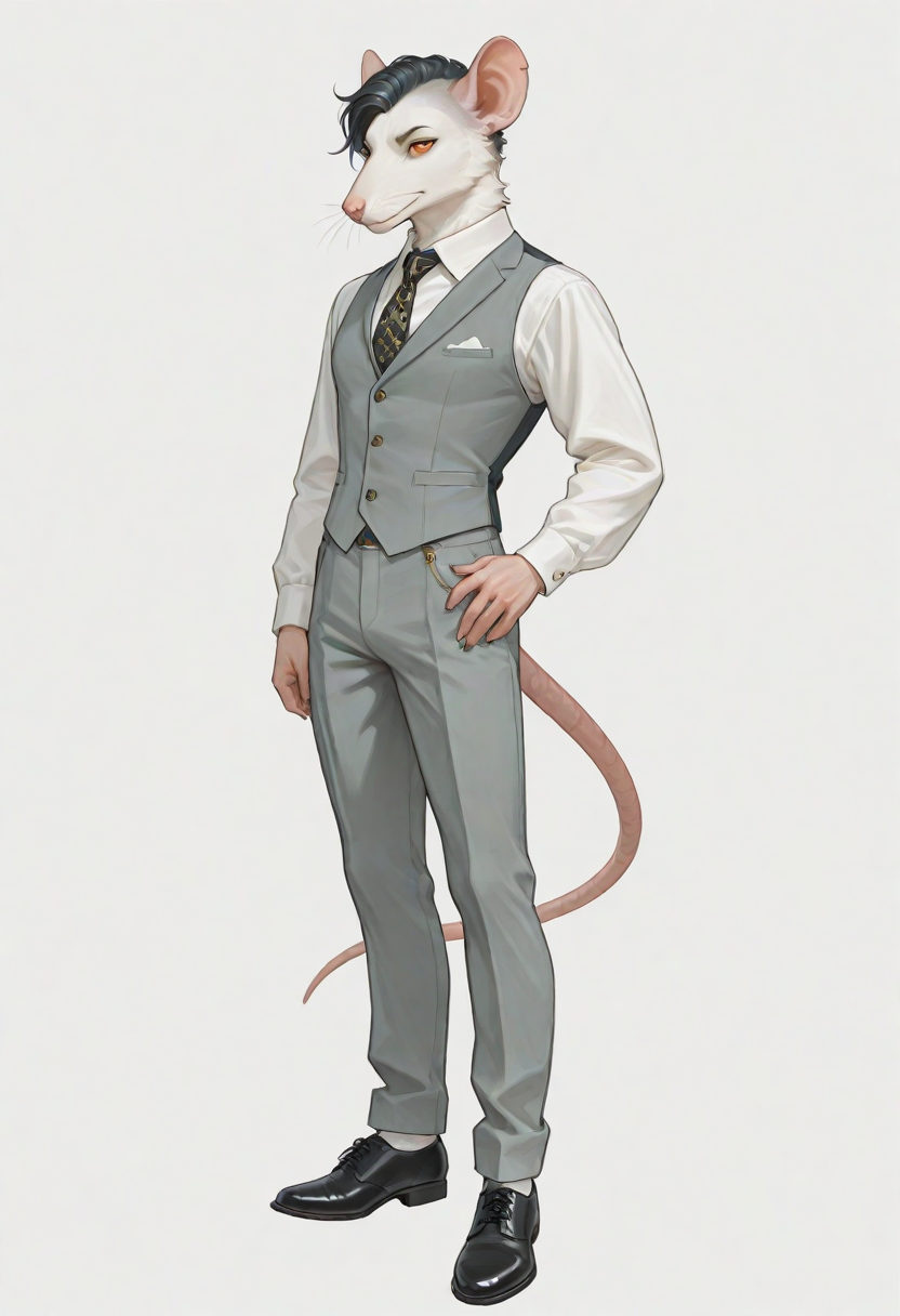 (人間化された雄のネズミ:1.3)、(白い毛:1.3)、背が高く、引き締まった体型、洗練された貴族的なプロポーション、長く細長いシルエット、背筋を伸ばした自信に満ちた姿勢