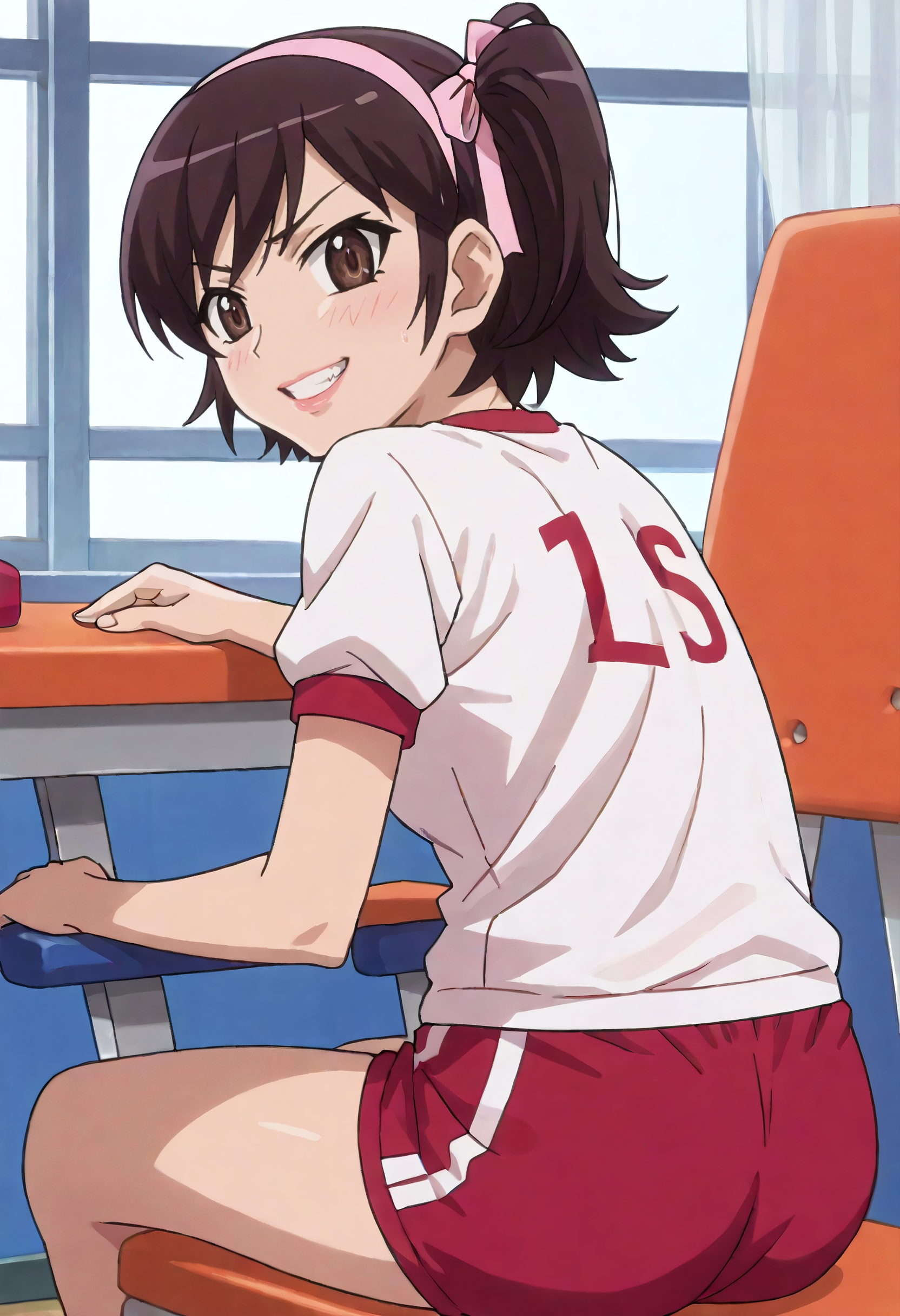 AyumiGymA, 셔츠, 체육복, 스포츠웨어, 흰색 셔츠, 한쪽 머리말, 리본, 헤어 리본, 티셔츠, 한쪽 올린 머리, 짧은 소매, 헤어밴드, 반바지, 빨간 반바지, 체육 반바지, 체육 셔츠, 세로 줄무늬 세 개,