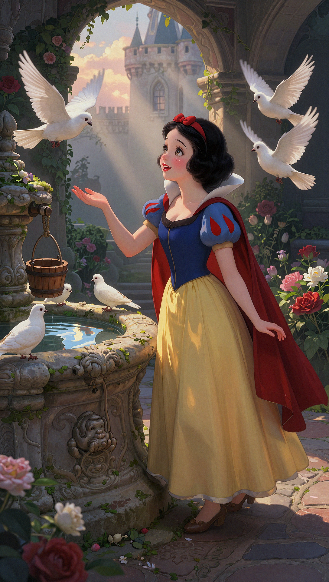 스노우 화이트는 1937년에 개봉한 월트 디즈니 프로덕션의 첫 번째 장편 애니메이션 영화 『스노우 화이트와 일곱 난쟁이』의 주인공이다. 1812년 그림 형제의 동화를 각색한 이 캐릭터는 월트 디즈니의 감독 하에 햄릴턴 루스키와 마크 데이비스가 애니메이션을 담당했으며, 아드리아나 캐셀로티가 목소리를 맡았다. 그녀는 눈처럼 하얀 피부, 피처럼 붉은 입술, 홍옥처럼 검은 머리카락을 가진 젊은 공주로, 보통 짧은 보브 헤어스타일에 특징적인 빨간 리본을 매고 있다. 그녀의 상징적인 복장은 푸른 상의, 빨간색과 파란색이 겹쳐진 풍성한 소매, 높은 흰색 칼라, 긴 노란 치마로 구성되어 있으며, 짧은 빨간 망토를 자주 함께 착용한다.