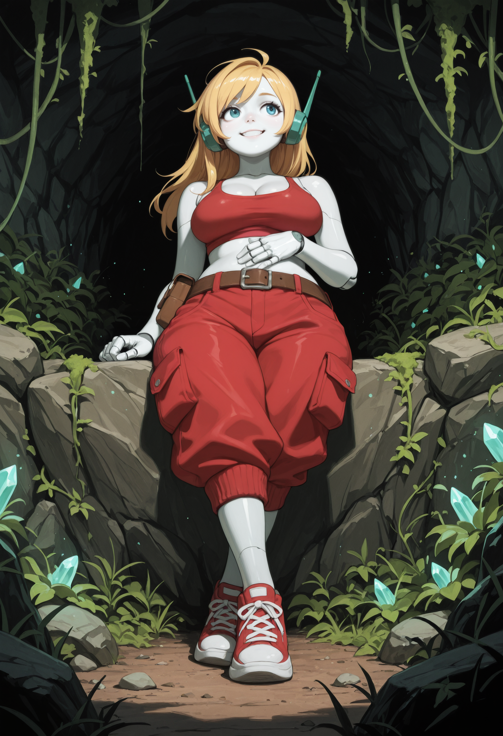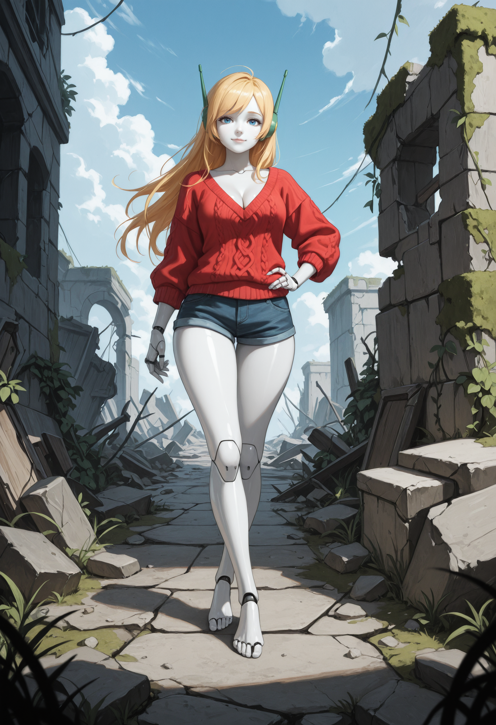 (Positive Prompts) lyncurl, android, robot joints, robot ears, colored skin, white skin, shiny skin, long hair, blonde hair, blue eyes,