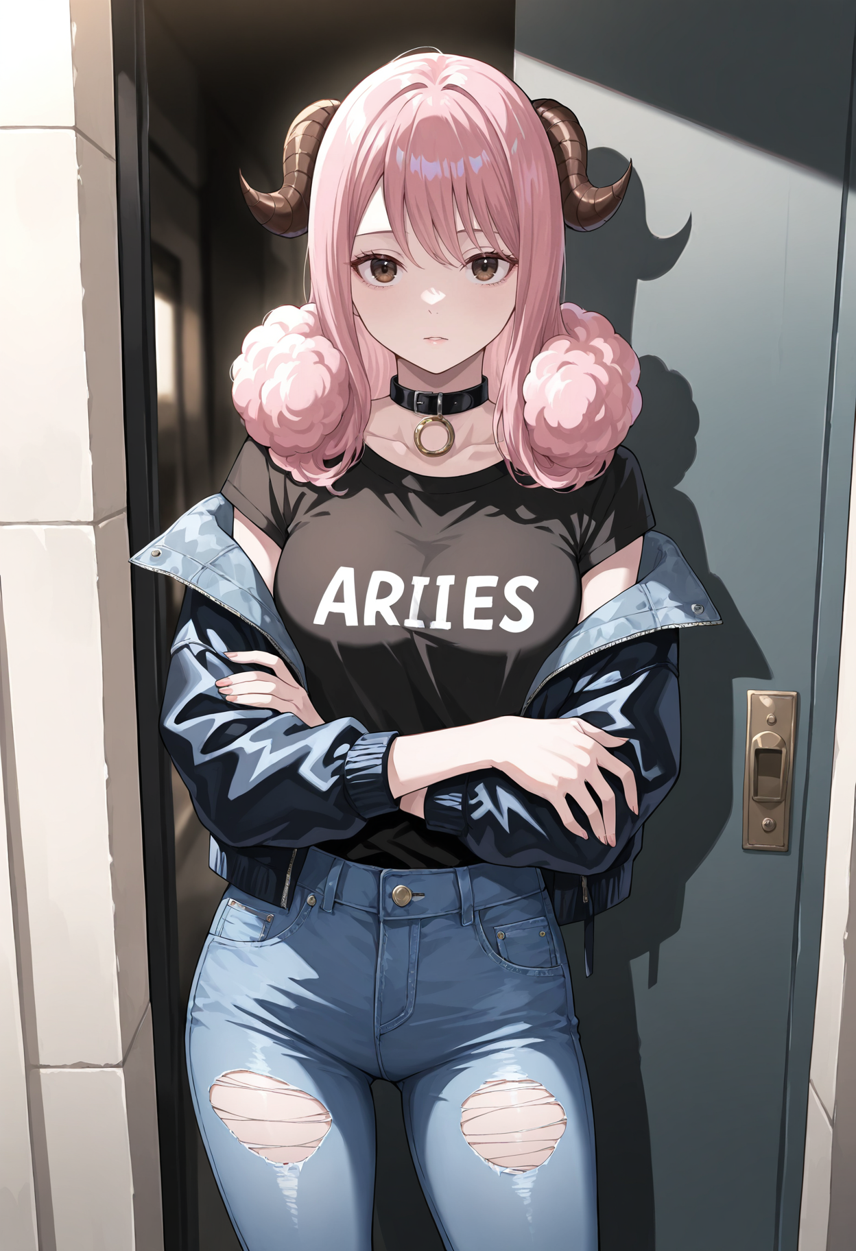 Aries_FT, 1girl,brown eyes,horns,sheep horns,pink hair,long hair