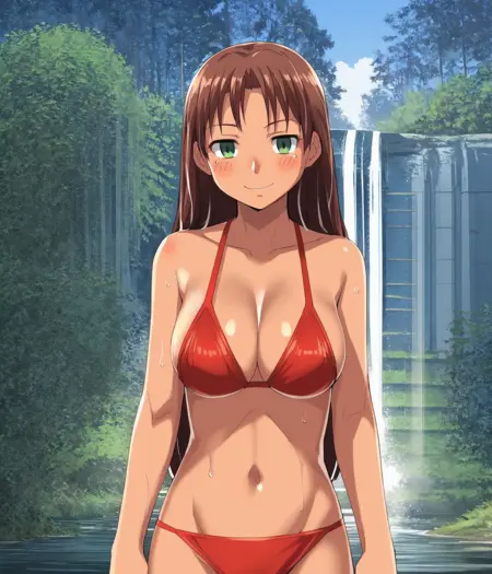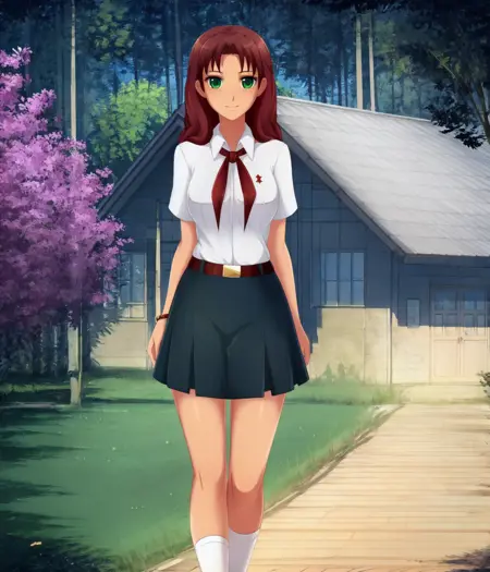 **강화 태그: human,**green eyes,brown hair,big breast,white hat,a red pioneer tie,pioneer form,t-shirt,skirt